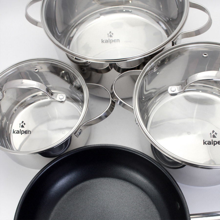 • Bộ nồi Inox 5 lớp đáy của Kalpen được làm từ chất liệu Inox 5 lớp, với đáy nồi có thiết kế đặc biệt để giúp nồi truyền nhiệt đều và nhanh chóng. Điều này giúp cho việc nấu nướng trở nên hiệu quả khi có thể sử dụng được trên nhiều loại bếp khác nhau.