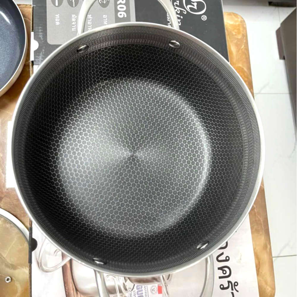 Chất liệu chảo: Inox 304 thân đúc đáy liền 5 lớp, lòng phủ chống dính Ceramic