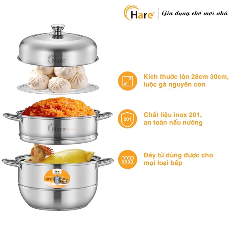 Thông số kỹ thuật: Tên sản phẩm: Bộ nồi hấp 3 tầng Thương hiệu: Hare Mã sản phẩm: HR-NH28F6 (28cm) - HR-NH30F6 (30cm) Kích thước: 28cm và 30cm Chất liệu: Thép không rỉ inox 201 Độ dày: 0.6mm nồi, 0.5mm xửng hấp, 0.5mm vỉ hấp, 0.5mm nắp nồi