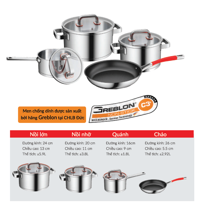 Bộ sản phẩm 3 nồi với 3 kích cỡ 16-20-24 cm giúp bạn dễ dàng nấu nướng với nhiều sự lựa chọn hơn. Bộ nồi bao gồm 2 nồi lớn và nhỏ, 1 nồi quánh có tay cầm nấu súp tiện lợi và 1 chảo chống dính đường kính 26cm.