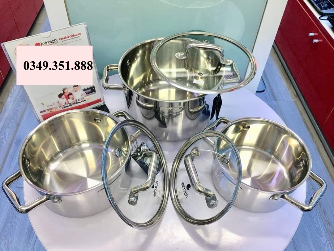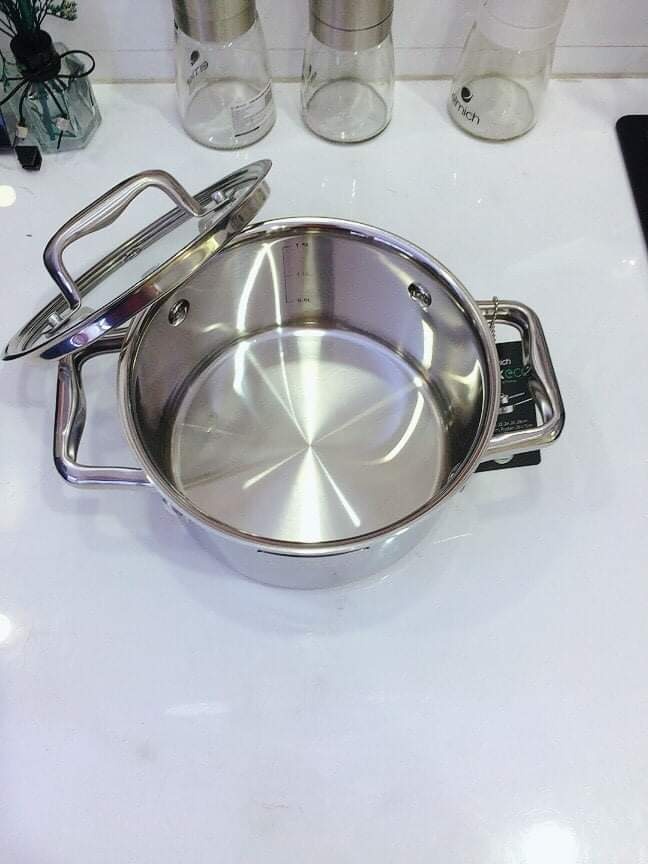 Bộ nồi gồm 4 nồi: Nồi nhỏ 16 cm để kho, hai nồi 18 cm và 20 cm trung để nấu canh. Nồi lớn 24 cm luộc gà nguyên con khoảng 1.5 – 1.8 kg.