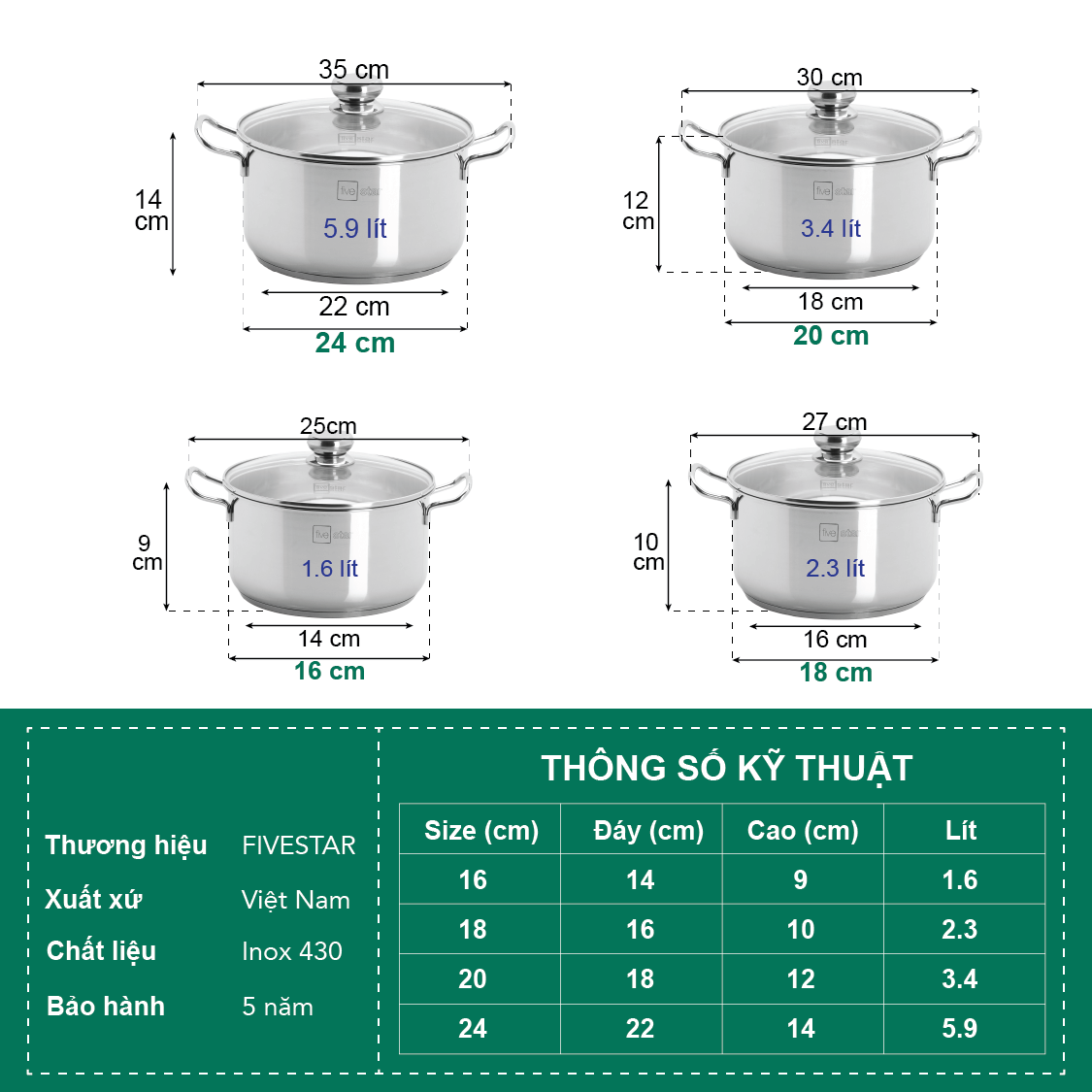 Bộ nồi 8 món FiveStar Inox 3 đáy