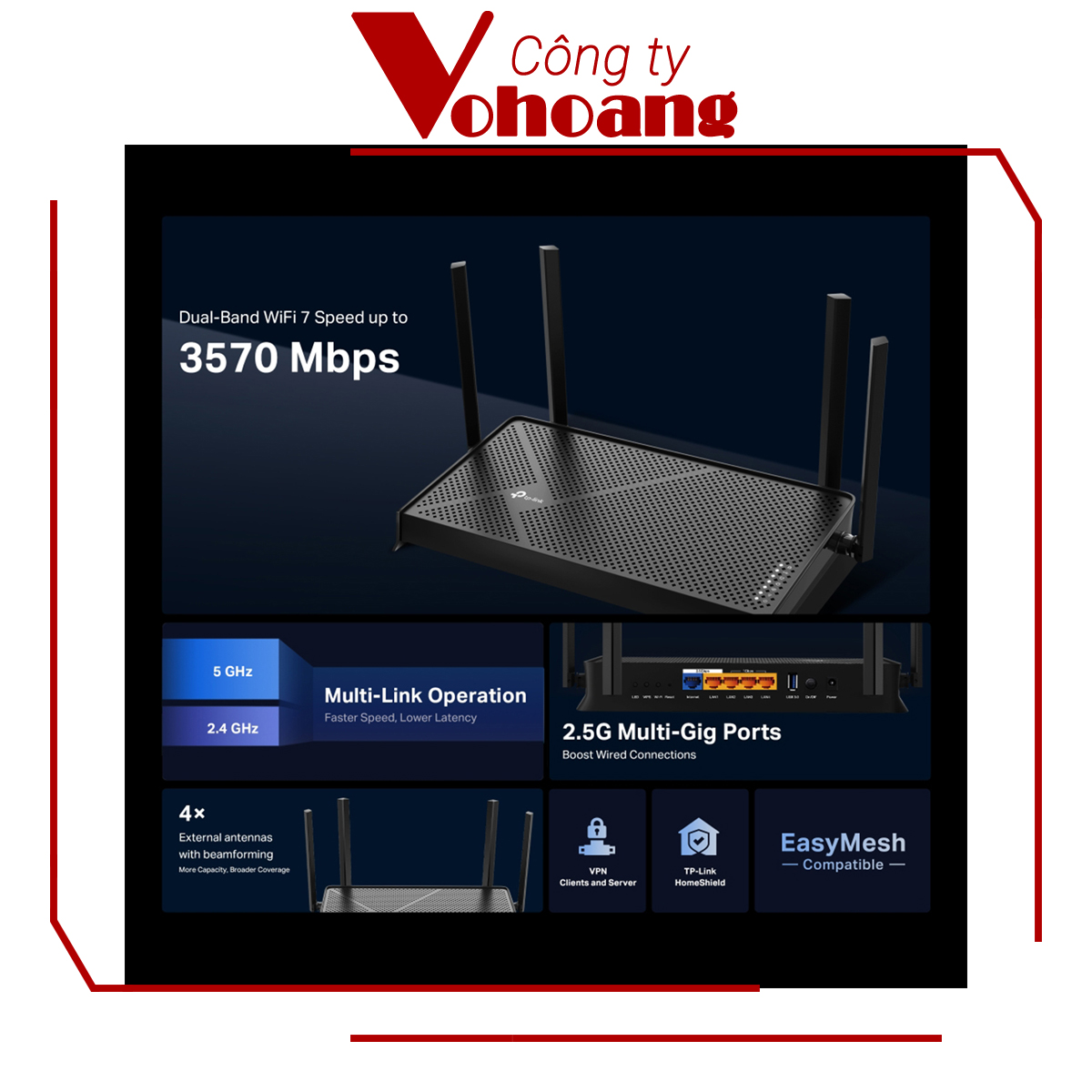 - Chuẩn Wi-Fi 7 tốc độ đến 3.6 Gbps - Băng tần kép 2.4GHz (688 Mbps) + 5GHz (2880 Mbps) - Multi-Link Operation (MLO) giảm độ trễ vượt trội - Công nghệ OFDMA & MU-MIMO tối ưu đa thiết bị - 2 ăng-ten hiệu suất cao phủ sóng rộng rãi - Cổng 2.5G + 1 cổng Gigabit tốc độ siêu nhanh - Bảo mật WPA3 chống truy cập trái phép - Quản lý qua ứng dụng TP-Link Tether - Hỗ trợ OneMesh mở rộng Wi-Fi liền mạch - Lý tưởng cho gaming, livestream, 4K/8K streaming   LƯU Ý KHI MUA HÀNG Cảm ơn quý khách đã quan tâm đến sản