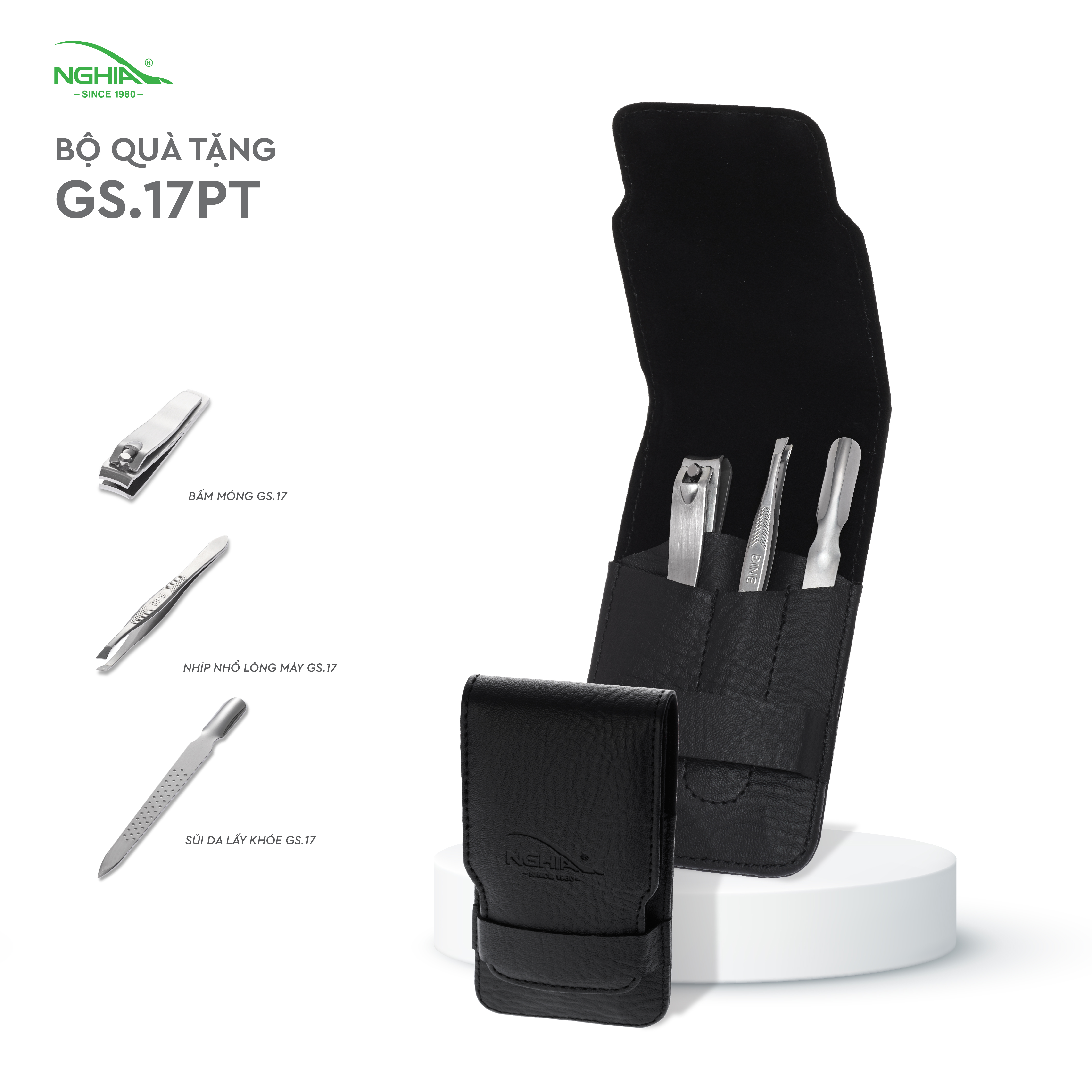 - Nhíp. Sản phẩm được sản xuất theo chuẩn ISO 9001 - 2015 . Thương hiệu Kềm Nghĩa Được người tiêu dùng và thợ chuyên nghiệp ưu tiên lựa chọn hơn 40 năm, đạt được nhiều giải thưởng như: Hàng Việt Nam chất lượng cao, Thương hiệu quốc gia. Bao bì Hộp giấy PT. Mô tả: Với hơn 40 năm kinh nghiệm trong lĩnh vực sản xuất kềm cắt da và kềm cắt móng, đội ngũ chuyên gia và các kỹ thuật viên lành nghề của chúng tôi đã và đang tạo ra các sản phẩm kềm cao cấp dưới thương hiệu Nghĩa và những nhãn hiệu khác như OMI, EVO Bộ sản phẩm quà tặng cao cấp GS.17 PT được sản xuất theo tiêu chuẩn Nghĩa đảm bảo chất lượng các sản phẩm cắt bén, êm, bền. Các sản phẩm được đặt/đựng trong bóp nhỏ gọn không chỉ giúp bảo quản sản phẩm mà còn có thể luôn mang theo bên mình khi đi làm, đi du lịch. Bộ sản phẩm quà tặng cao cấp GS.17 PT thích hợp làm quà tặng cho khách hàng, nhân viên, đồng nghiệp, Lưu ý sử dụng: Sử dụng phù hợp với công dụng riêng của từng sản phẩm, không sử dụng để cắt các vật cứng. Cách bảo quản sản phẩm :