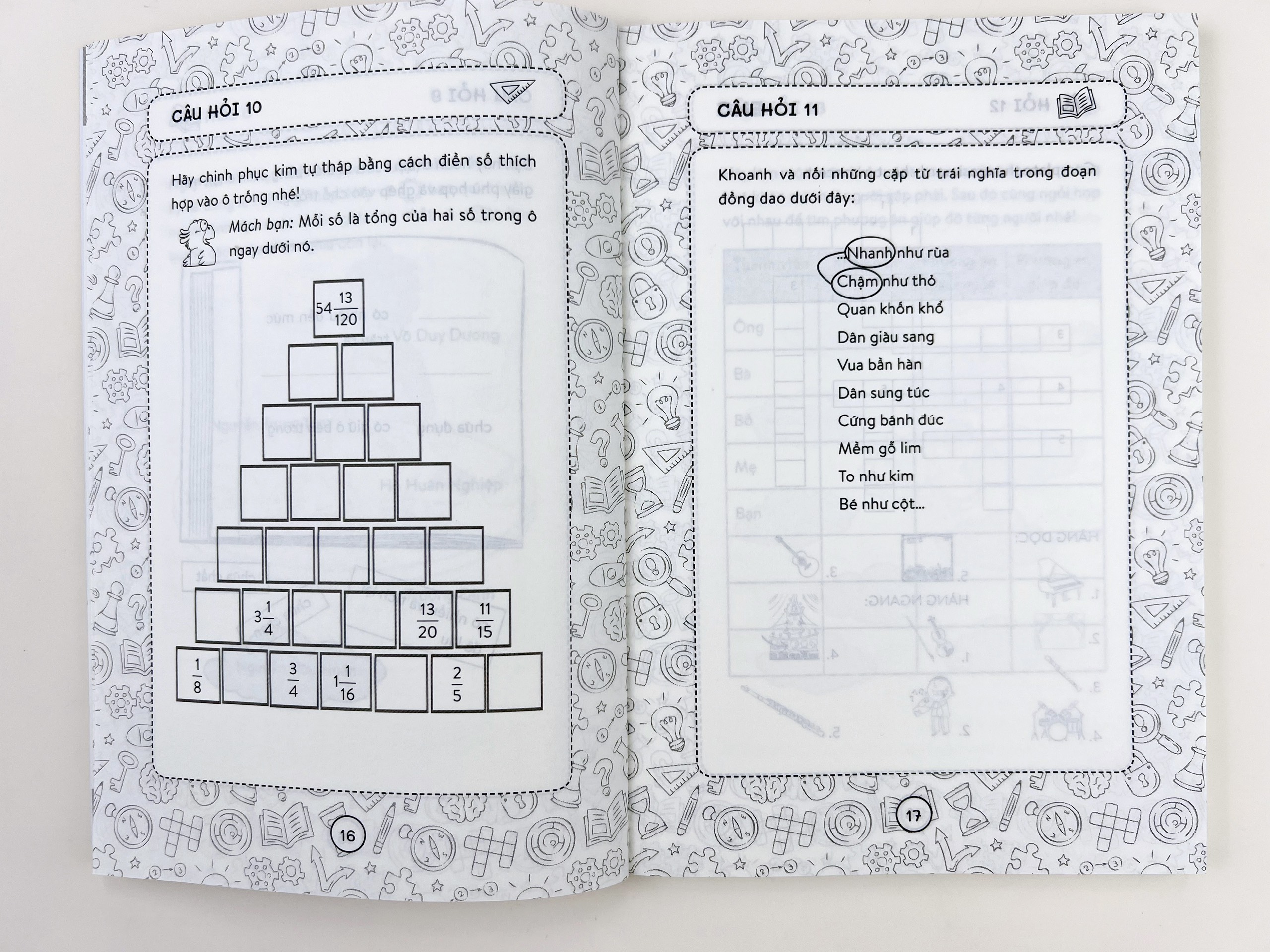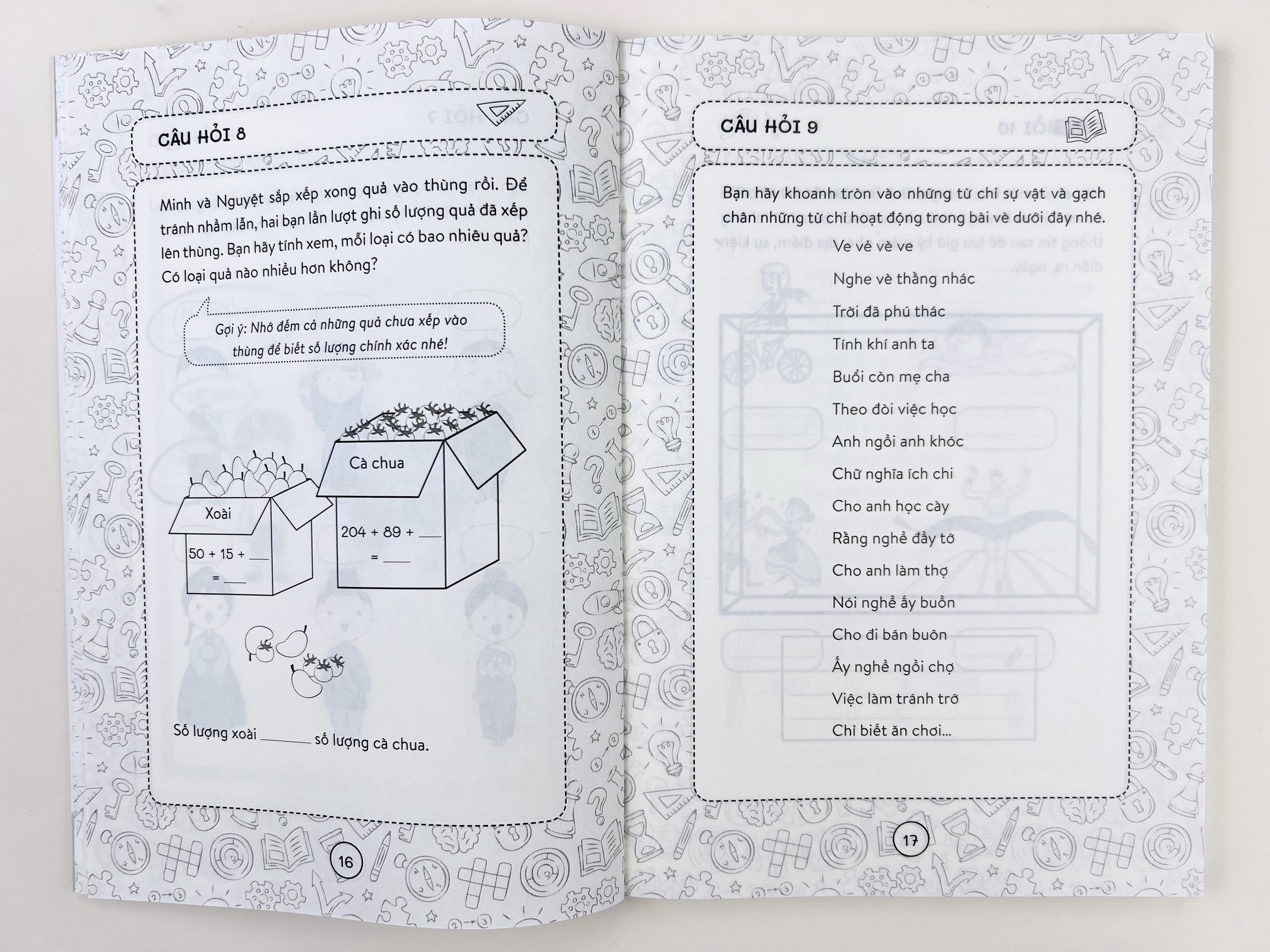 Những câu hỏi biên soạn giúp trẻ hình thành tư duy tổng hợp và phát triển toàn diện những tri thức đã học. Đồng thời, với thiết kế sáng tạo và khoa học, lồng ghép dưới dạng các trò chơi trí tuệ như: dò m ì n, nối số, xây tháp, hỏi đáp thông trẻ vui thích chơi cùng cuốn sách, cùng những tri thức xuất hiện vừa quen thuộc vừa mới lạ.