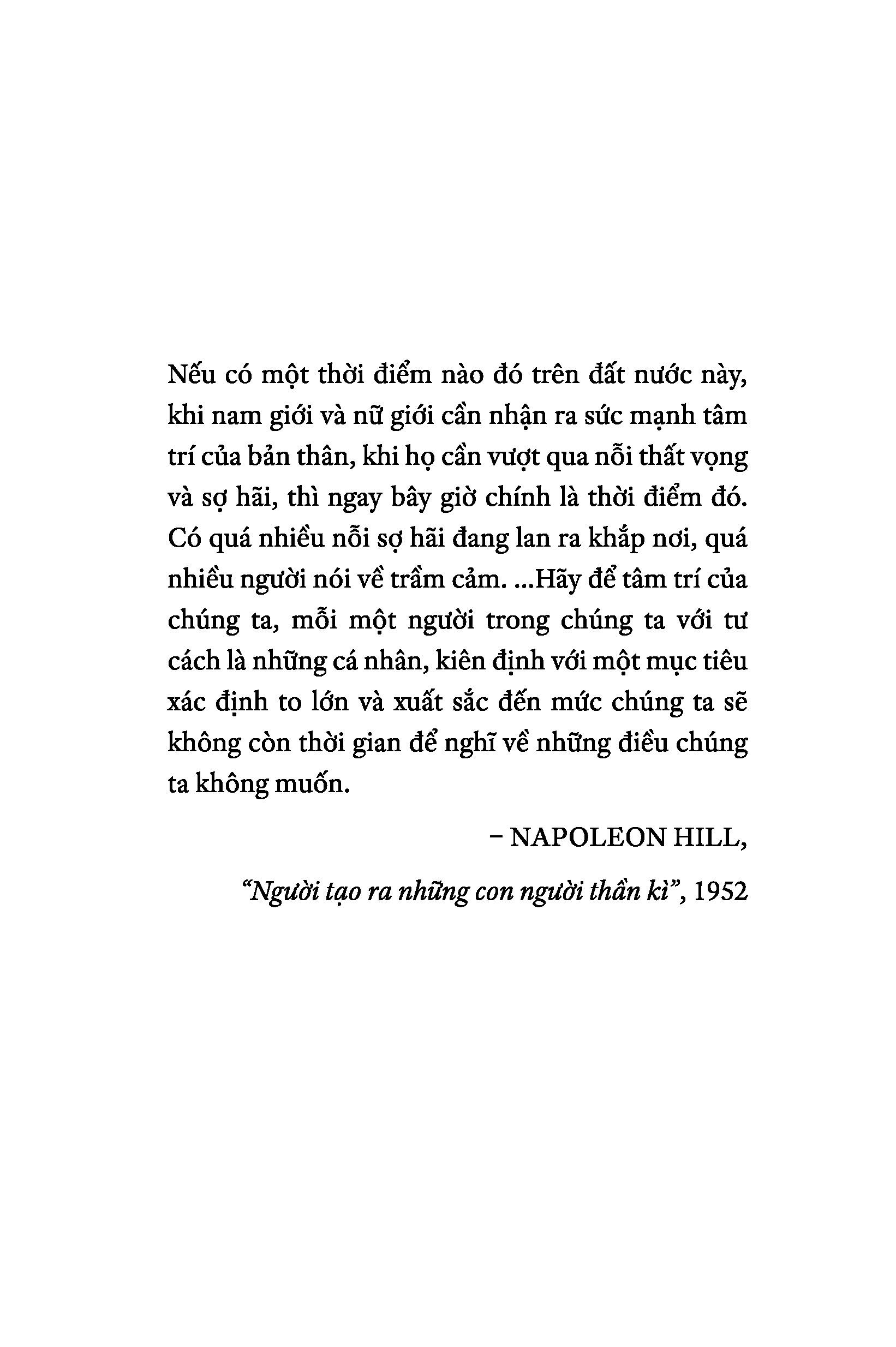 Cuốn sách "Thoát khỏi những nỗi sợ hãi của bạn" này bao gồm lời những lời khuyên hay nhất của Napoleon Hill để rũ bỏ nỗi sợ hãi, tìm thấy cơ hội trong những thất bại tạm thời, và để sống cuộc đời có mục đích.