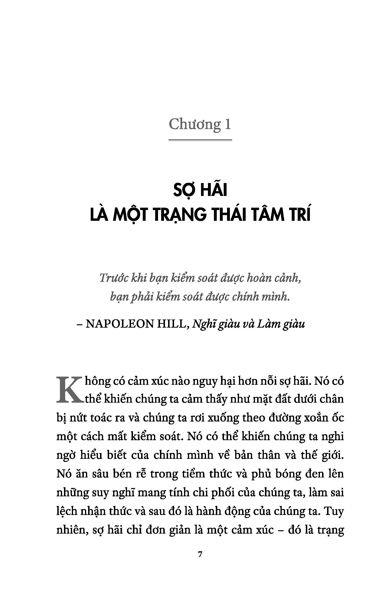 Nỗi sợ hãi là một trong những trở ngại lớn nhất đối với thành công, hạnh phúc và cảm giác thỏa nguyện, và đó cũng là một trong những trở ngại khó khắc phục nhất. Nỗi sợ hãi bắt nguồn từ sâu trong tiềm thức và khiến những suy nghĩ chiếm hữu tâm trí bạn trở nên u tối, nhận thức và hành động của bạn do đó cũng trở nên lạc lối. Nhưng nỗi sợ hãi không nhất thiết phải chi phối câu chuyện cuộc đời bạn. Đó chỉ đơn giản là một cảm xúc – một cảm xúc có thể được làm chủ và chuyển hóa để có lợi thay vì gây bất lợi cho bạn.