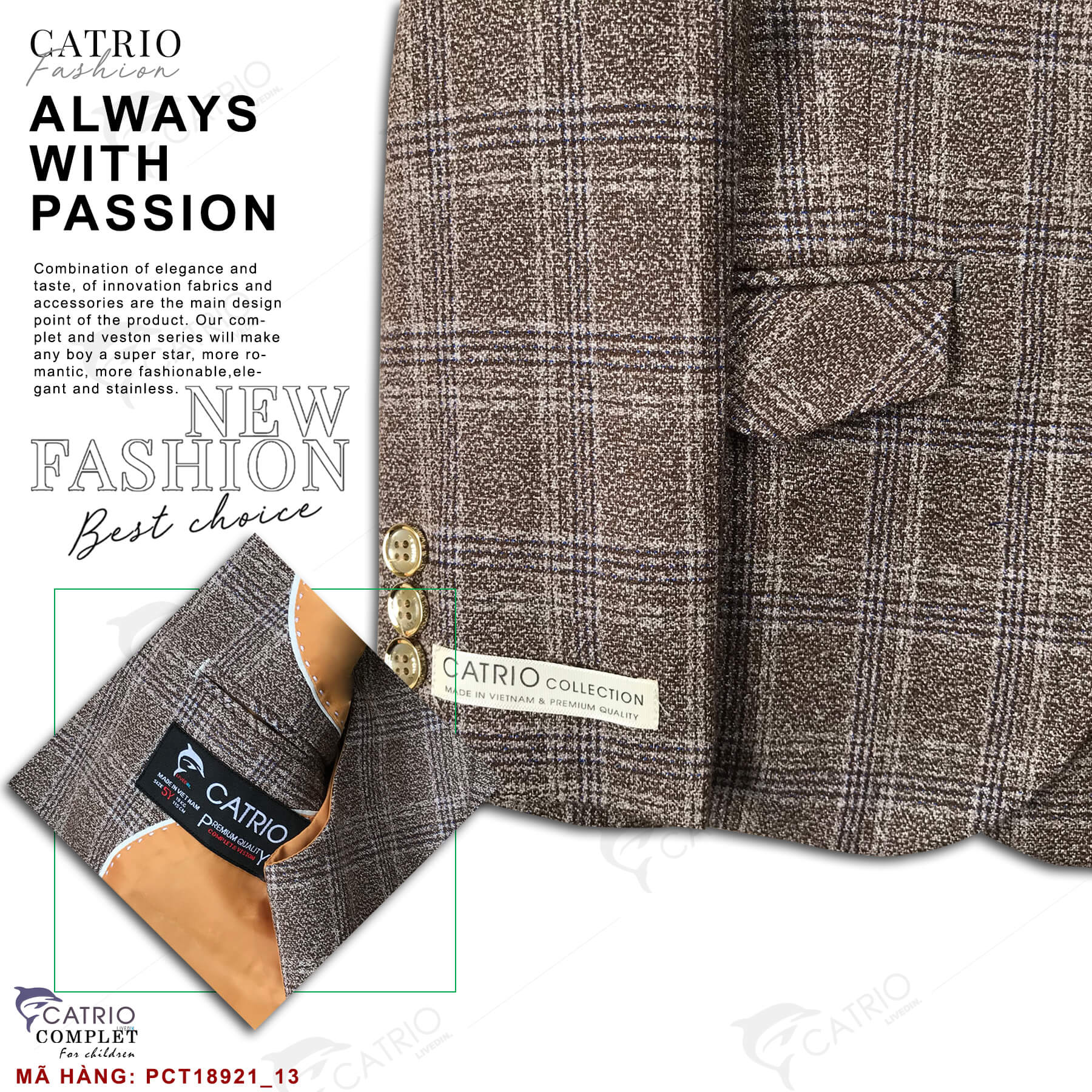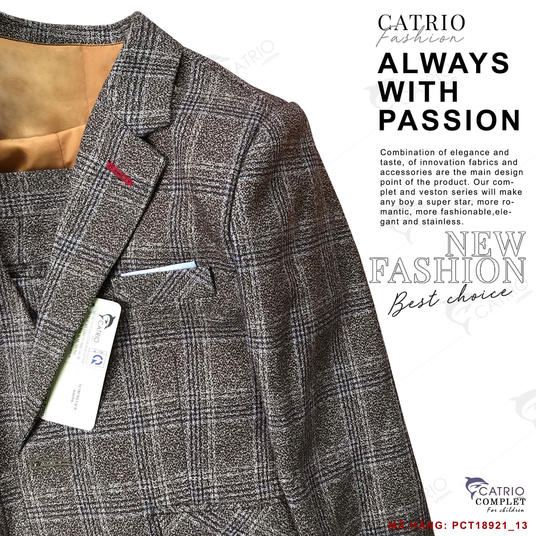 ✨BỘ SUIT TRẺ EM CATRIO PCT18921/13 là bộ đồ vest bé trai CATRIO TỪ 2 TUỔI ĐẾN 7 TUỔI (12KG_ 28KG) gồm 3 chi tiết áo vest bé trai + quần dài bé trai+áo gilet trẻ em, vải dạ mềm mượt để bé mặc biểu diễn, dự lễ tiệc cưới hỏi tết