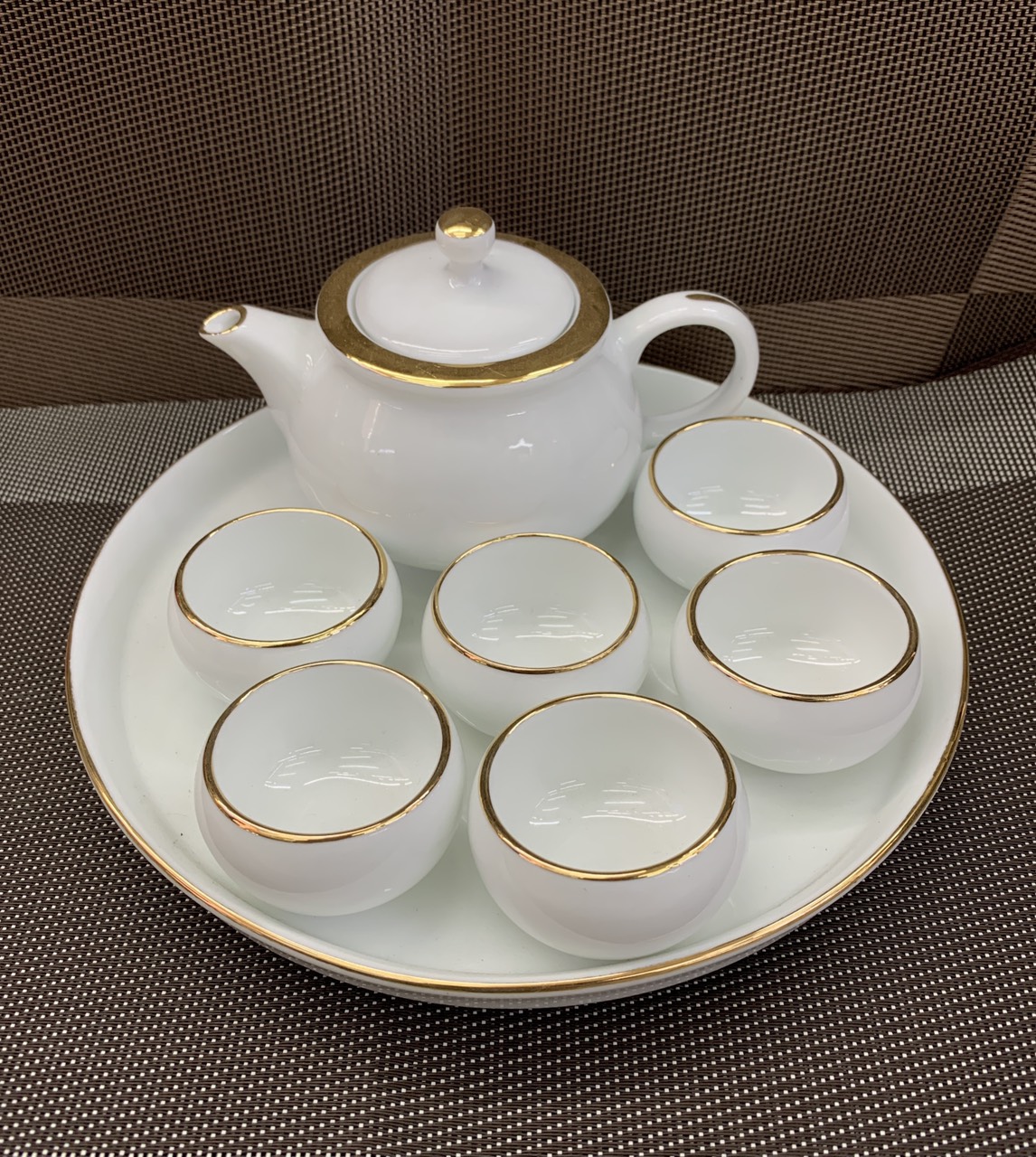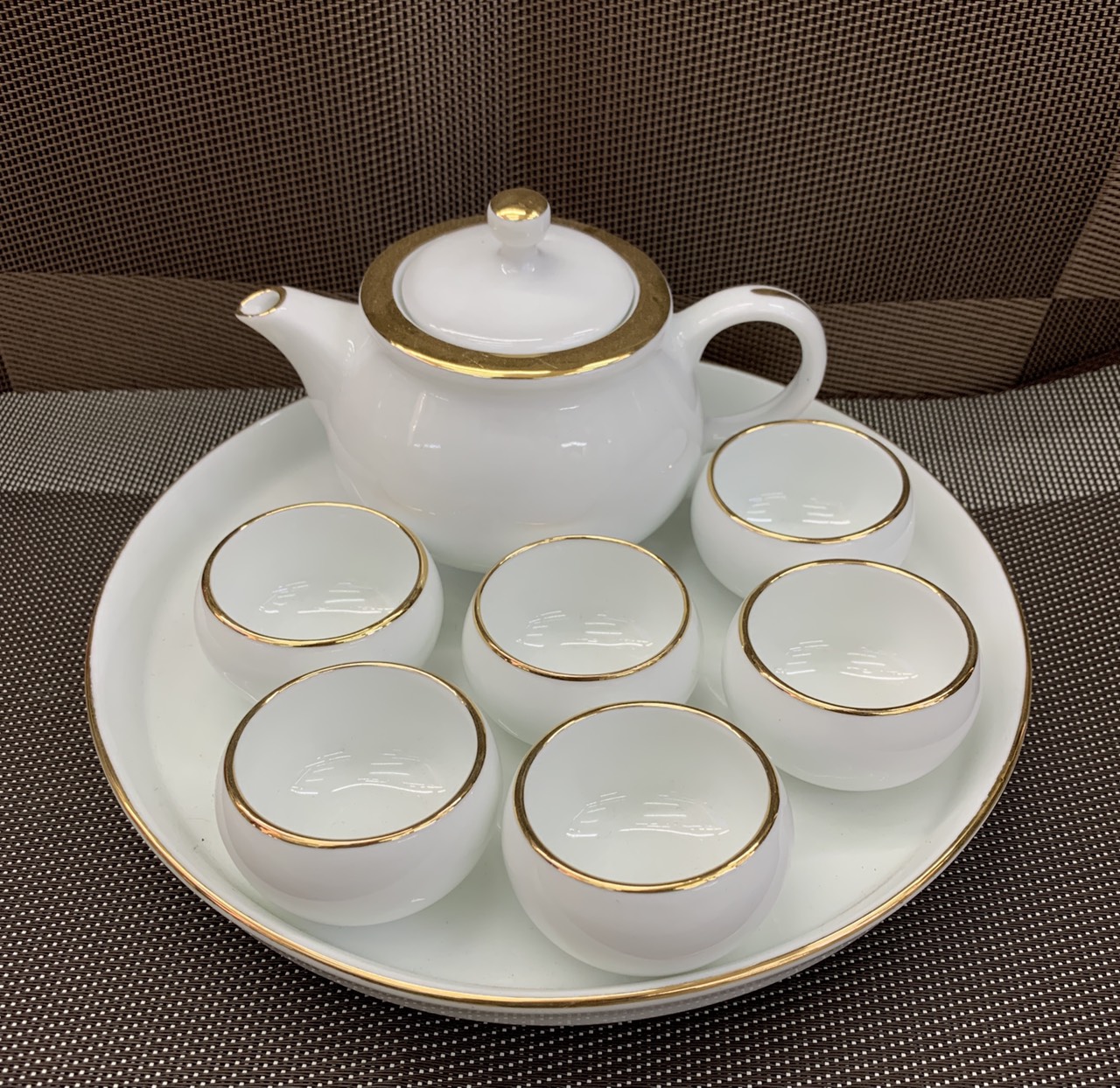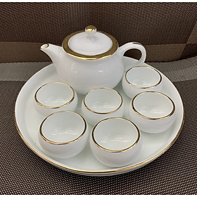 BỘ ẤM CHÉN TRẮNG CHÓP LỬA KHAY TRÒN VẼ SEN CHỈ VÀNG - Hotline 0828397333