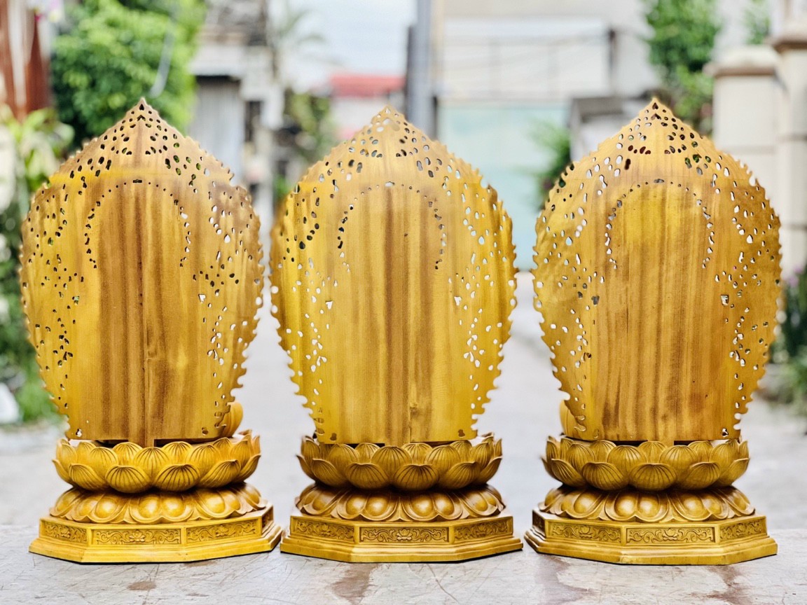_ Bộ tượng phật tam thánh được trạm khắc vô cùng tỉ mỉ ,tinh sảo tỉ mỉ ,Đi hầu hết tất cả mọi chi tiết góc ngách nội dung hoa văn của tượng đều được gọt tỉa chỉnh sửa hoàn toàn bằng tay thủ công ,Đồng thời bộ tượng được kiểm định kỹ lưỡng ,khắt khe ,như cho vào thẩm sấy cho gỗ khô kiệt .Mục đích trống dập nứt vênh mo mối mọt ,Kết hợp với trà nhám đánh giấy giáp nhiều nước sờ mát lạnh ,Rồi cho vào phun lót làm bóng mờ ,Để giữ lại mầu sắc vân gỗ tự nhiên ,Bộ tượng được làm và hoàn thiện ,do bàn tay khối óc tài hoa ,Từ những người thợ dầy rặn kinh nghiệm ,Cũng như tay nghề cao trong làng nghề truyền thống .Chính vì thế bộ tương tây phương tam thánh đã đáp ứng đầy đủ những tiêu trí ( Đẹp bền rẻ ) Thẩm mỹ nghệ thuật với chất lượng tuyệt vời
