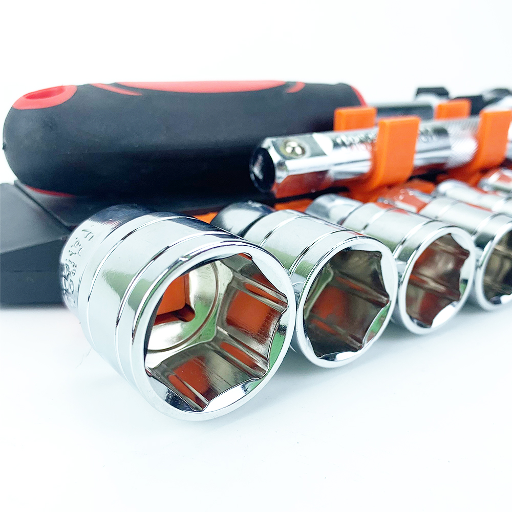 Bộ khẩu tuýp bao gồm 12 chi tiết khác nhau: 10 đầu khẩu có kích cỡ khác nhau, 1 cần xiết, 1 đầu nối dài rất tiện ích.