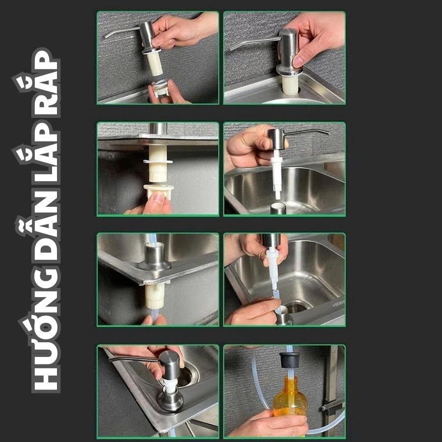 - Sau khi lắp thì phần kết nối với dây dẫn nằm dưới bồn, đầu dây dẫn còn lại kết nối với bình (can) chứa nước rửa chén