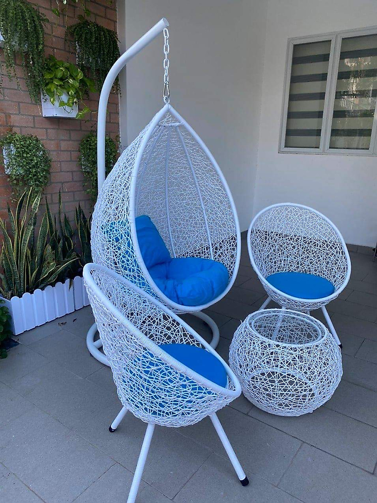 - Bộ sản phẩm gồm : 01 bàn mặt tròn kính + 02 ghế đơn + 01 xích đu như hình.