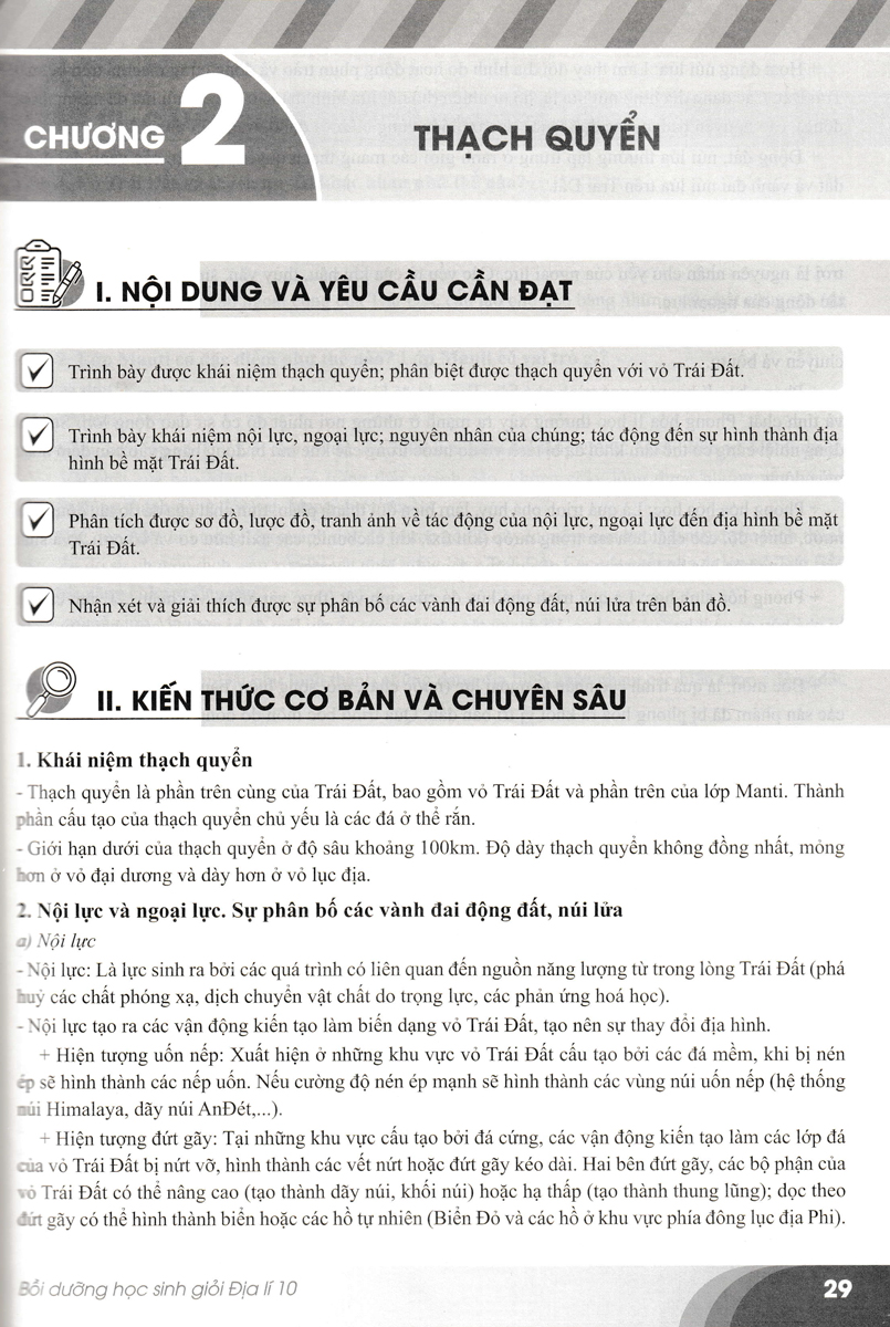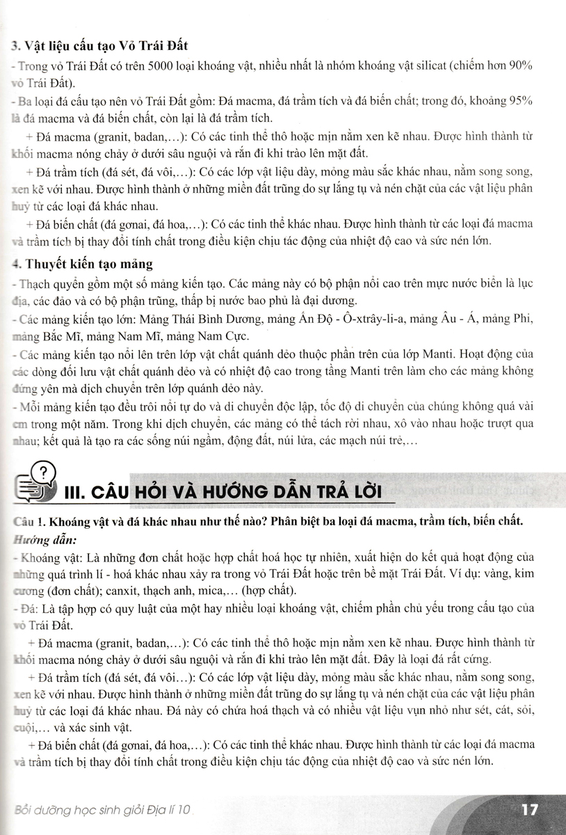 Phần B - Câu hỏi, bài tập: Gồm các câu hỏi, bài tập sát với yêu cầu cần đạt và nội dung cơ bản của chương trình và các câu hỏi, bài tập nâng cao phát triển năng lực và phẩm chất của học sinh giỏi Địa Lí lớp 10. Trước phần câu hỏi, bài tập ở mỗi nội dung chủ đề có yêu cầu cần đạt, nội dung cơ bản và chuyên sâu để định hướng chung về phạm vi và mức độ cho các câu hỏi, bài tập. Các nội dung chuyên sâu chủ yếu được phát triển và nâng cao hơn từ các nội dung cơ bản của chương trình.
