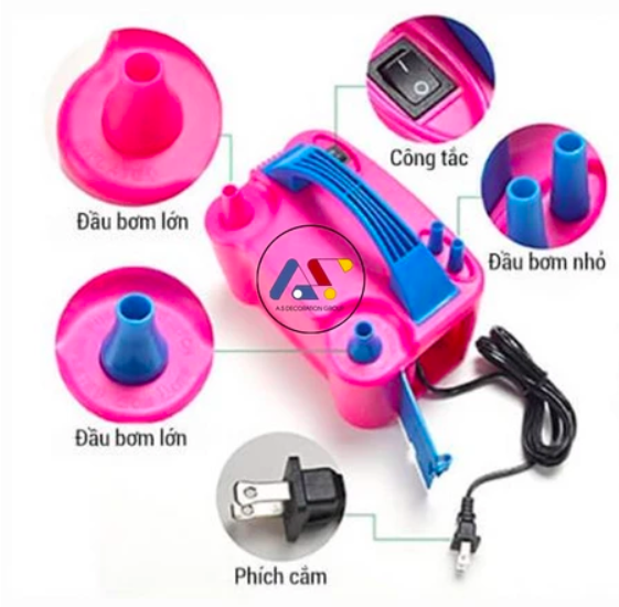 Thông tin sản phẩm: • Tên sản phẩm: Máy bơm điện bơm bóng bay mini 2 vòi • Công suất: 400W • Điện áp: 220V - 240V • Chất liệu: Nhựa ABS cao cấp, bền