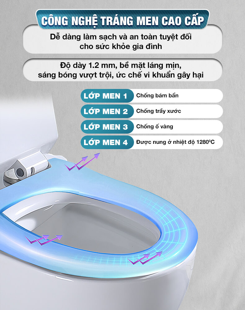 Ứng dụng công nghệ trắng sáng đột phá, nước men sáng bóng, kháng khuẩn được phủ theo công nghệ hiện đại bền đẹp thách thức thời gian. Ngoài ra trong lòng bàn cầu còn được tráng lớp men chống bám bẩn giúp cho mọi vết bẩn được dễ dàng cuốn trôi đi. Không bị ố vàng và luôn luôn sáng bóng. Bảo hành phần chất liệu sứ, nắp bồn cầu và phụ kiện cho sản phẩm nếu có bất cứ lỗi nào do nhà sản xuất.