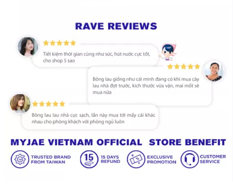 *Thông số kỹ thuật* - Thương hiệu: MyJae - Tên sản phẩm: Bông lau kháng khuẩn cho Cây lau nhà tự vắt kèm thùng 2 ngăn MyJae - Kích thước: 33 cm x12cm - Màu