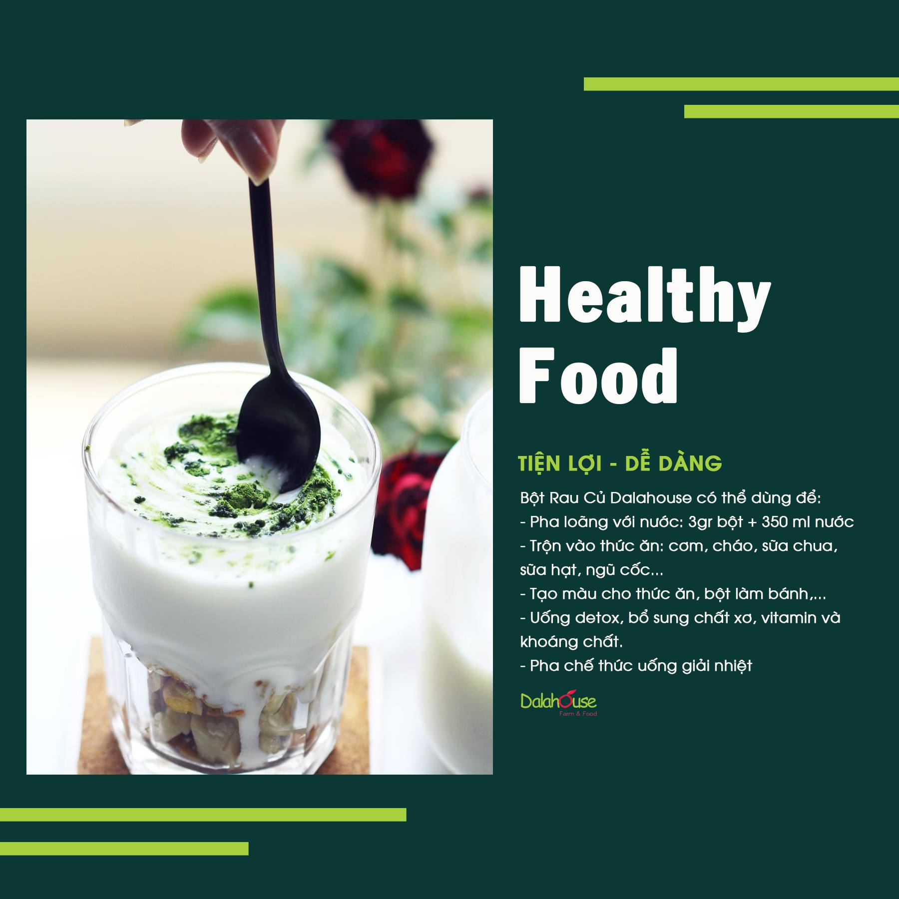Ứng dụng của bột rau củ sấy lạnh. Với sản phẩm Bột rau củ hữu cơ an toàn & có giá trị dinh dưỡng cao, DalaHouse mang đến cho người tiêu dùng nhiều lựa chọn bổ dưỡng, tiện lợi. Sản phẩm đặc biệt hữu ích với: