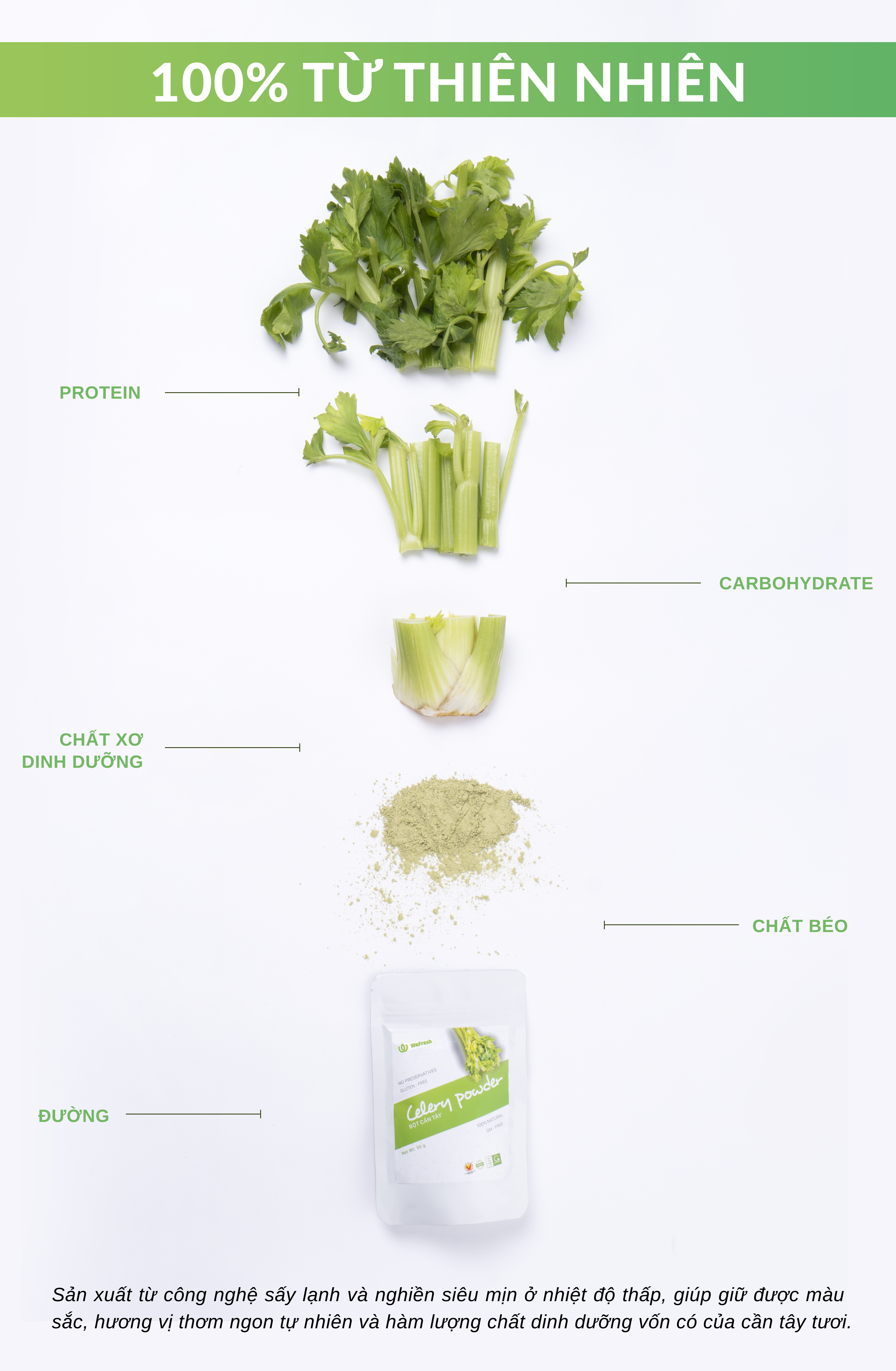 Thành phần: 100% Bột Cần Tây nguyên chất sấy lạnh theo tiêu chuẩn Châu Âu, không chất bảo quản, phẩm màu, hương liệu hay hóa chất.