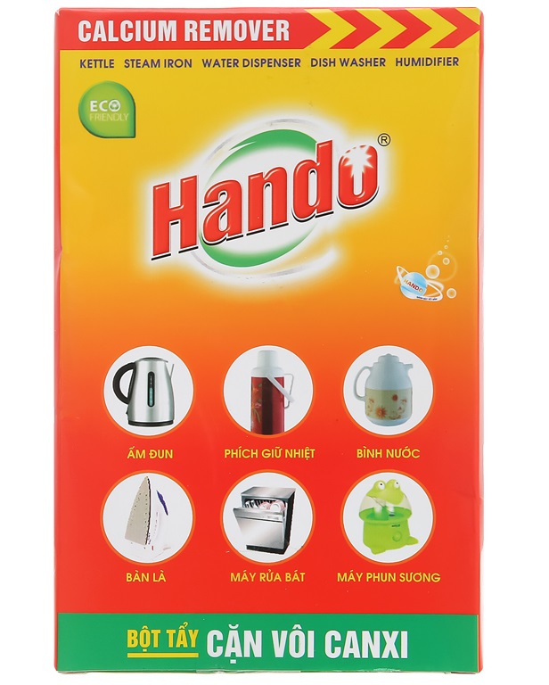 Thông tin sản phẩm Tên sản phẩm : Bột tẩy cặn nước đá vôi ấm đun, bình nước Hando Hướng dẫn sử dụng : Cho nước vào ấm và phích, đổ bột theo tỷ lệ