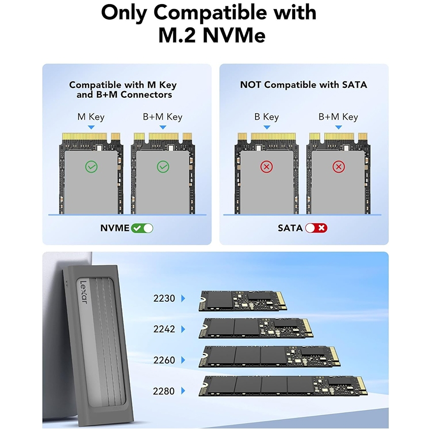 ✨Box ổ cứng Lexar E300 M.2 SSD Enclosure hỗ trợ NVMe SSD 2280/2260/2242/2230, USB 3.2 Gen 2 - Hàng chính hãng