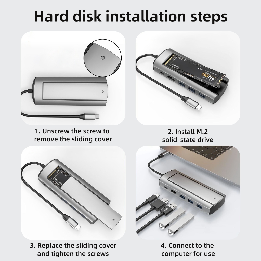 1. Features: Extend more connections from USB Type-c 2. Input: USB Type-C positive 3. Output: 2*usb-c + RJ45 + HDMI 4K60HZ + PD + SD + TF + 2*USB3.0 4. Material: aluminum alloy shell, gold-plated