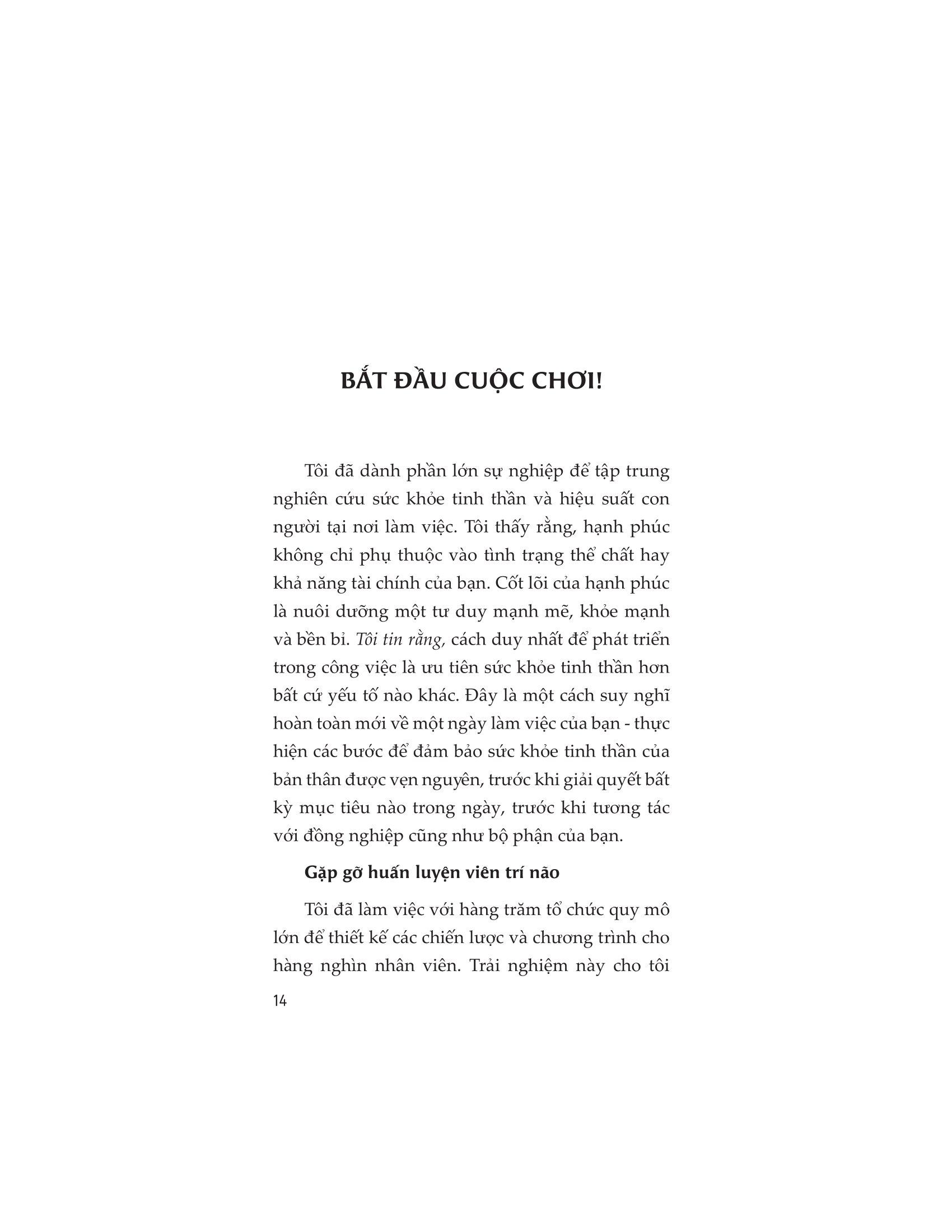 Brain On! - Rèn Luyện Tâm Trí Trong Công Việc Khi bạn để cho bộ não vận hành ở chế độ tự động, sợ hãi và lo lắng chính là chế độ mặc định của bạn. Điều này có nghĩa là bạn liên tục cảm thấy quá tải, mất tập trung, kiệt sức và căng thẳng tại nơi làm việc. Trong Brain On!, tác giả Deb Smolensky giới thiệu các chiến lược rèn luyện tinh thần có tính thực tiễn cao để bạn sẵn sàng thể hiện bản thân trong môi trường làm việc nhiều áp lực và luôn thay đổi. Điều chúng ta hướng tới không chỉ là hoàn thành các mục tiêu công việc với hiệu suất tối ưu, mà còn là làm điều đó trong khi vẫn đảm bảo được sức khỏe tinh thần và thể chất, tràn đầy năng lượng cũng như tinh thần tích cực. Cho dù bạn là một cá nhân chủ động muốn duy trì năng lượng và hiệu suất làm việc, hay một nhà lãnh đạo tổ chức đang tìm cách cải thiện văn hóa của tập thể, thì Brain On! đều có thể trở thành hướng dẫn giúp bạn tối ưu hóa bộ não, giành chiến thắng vượt trội trong ngày làm việc và xây dựng môi trường tổ chức hướng tới sự tăng trưởng toàn diện. Cuốn sách chia thành ba phần, được thiết kế để “thay đổi hoàn cảnh” nhằm giúp mọi người trở nên bền bỉ về mặt tinh thần trong công việc: