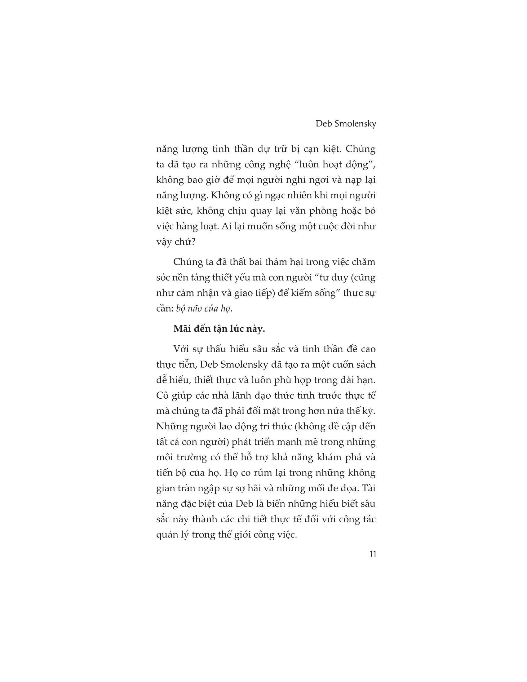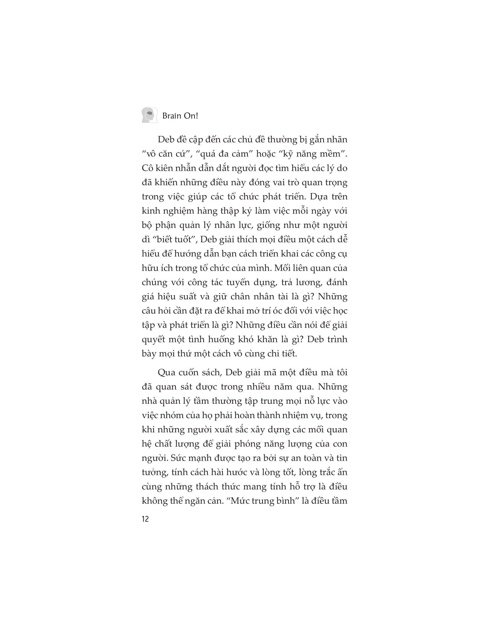 • Phần III: Phương pháp“Kích hoạt Bộ não” dành cho tổ chức, được thiết kế cho các nhà lãnh đạo, bộ phận nhân sự cũng như toàn bộ tổ chức để giúp nhân viên luôn tạo ra một môi trường phát triển mạnh mẽ. Về tác giả: Deb Smolensky là tác giả, diễn giả và nhà lãnh đạo tư tưởng trong lĩnh vực hiệu suất con người và duy trì sức khỏe tại nơi làm việc. Trong 25 năm qua, Deb đã nhận được nhiều chứng nhận về những đóng góp cho năng suất và sức khỏe của tổ chức. Cô tư vấn cho nhiều khách hàng, bao gồm nhiều công ty trong danh sách Fortune 500, để phát triển các chiến lược, chương trình và phương pháp thực hành nhằm tiếp thêm sức mạnh cho nhân viên và đội ngũ điều hành, giúp họ xây dựng cuộc sống lành mạnh, hiệu quả tại nơi làm việc thông qua các giải pháp sáng tạo, giàu ý nghĩa và hấp dẫn. Một số lời khen: “Chúng ta thường đánh giá thấp sức mạnh bên trong bộ não thần kỳ của con người. Trong cuốn sách này, Deb Smolensky đi sâu vào vùng vỏ não trước trán, giới thiệu lại cho chúng ta một cách mạnh mẽ và đầy hứng khởi về những điều có thể xảy ra khi sử dụng trí óc một cách có chủ ý.” DANIEL H. PINK, tác giả những cuốn sách bán chạy nhất: Drive, The Power of Regretvà A Whole New Mind “Deb thấu hiểu những thách thức khi làm việc trong thế giới ngày nay cũng như những cơ hội để cải thiện môi trường làm việc tốt hơn cho các cá nhân và tổ chức. Brain On! là nguồn tài nguyên tuyệt vời để khơi gợi các kỹ năng xã hội quan trọng, nhằm khơi dậy lòng trắc ẩn, năng lượng, hạnh phúc và lòng biết ơn tại nơi làm việc cũng như những ngày làm việc.”