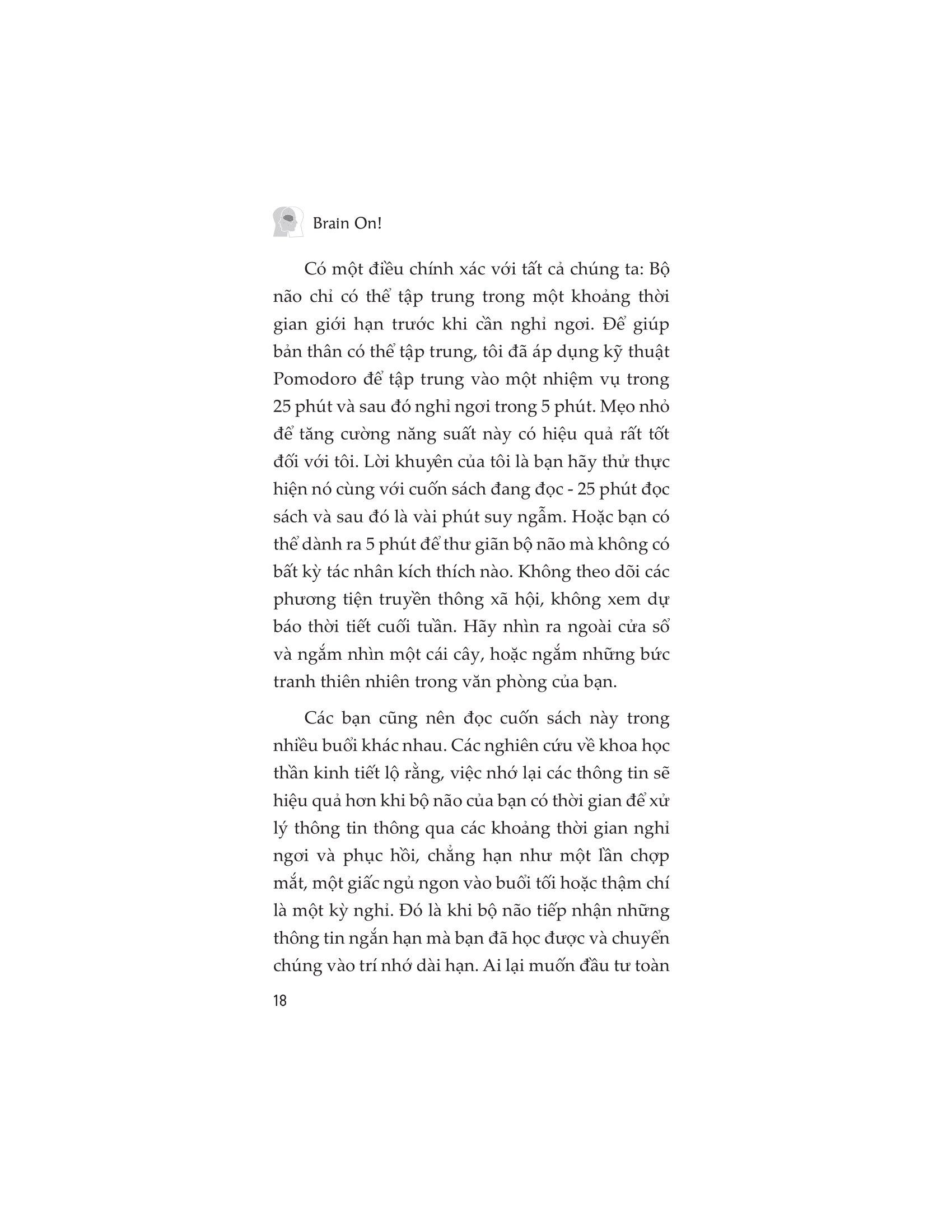 • Phần II: Những cách thức đã được chứng minh để giữ cho bộ não của bạn tập trung và hướng tới mục tiêu đã định. Bạn sẽ học cách tạo lập lịch trình rèn luyện tinh thần của riêng m.ình để luyện tập trí não, sử dụng các kỹ thuật và thói quen hiệu quả nhằm vượt qua những trở ngại trong công việc.