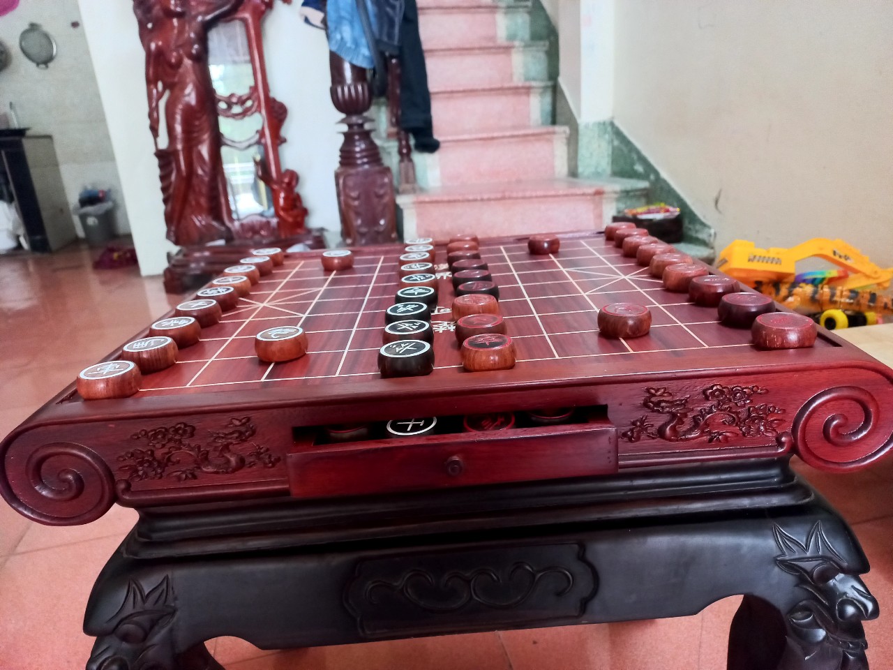 Bộ bàn cờ tướng chân cuốn thư có ngăn keo ,Và quân cờ tướng được làm bằng chất liệu gỗ hương tự nhiên 100%  Kích thước bàn cờ 50×56×8cm Kích thước quân cờ tiên gù mặt rộng 4cm cao 2cm Bộ bàn cờ được thiết kế theo kiểu dáng chân cuốn thư ,có ngăn kéo ,để kéo ra kéo vào cất cờ rất tiện lợi ,Trên mặt bàn thì được kẻ danh giới các đường chỉ rất sâu rồi khảm sương trắng rất bền và sắc nét ,Đạt độ chính xác cao ,Cũng như tuổi thọ có độ bền theo năm tháng mà không sợ ,phai mờ  , ,Để rễ phân biệt danh giới giữa hai .Mục đích để tránh nhầm lẫn .Còn quân cờ được tiện gù và khắc hai mặt với sự công phu tỉ mỉ rất cao .Bàn cờ và quân cờ được kiểm định rất khắt khe như cho vào thẩm sấy .Mục đích trống dập nứt vênh mo mối mọt .Song cho vào trà nhám đánh giấy giáp nhiều lần cho sạch sẽ sờ mát lạnh ,Rồi cho vào phun lót làm bóng mờ giữ lại mầu sắc vân gỗ tưp nhiên .Bàn cờ và quân được làm và hoàn thiện do bàn tay khối óc tài hoa ,Từ những người thợ giàu kinh nghiệm cũng như tay nghề cao trong làng nghề truyền thống .Chính vì thế bộ bàn cờ đã đáp ứng đầy đủ những tiêu trí ( Đẹp bền rẻ ) Thẩm mỹ nghệ thuật với chất lượng tuyệt vời
