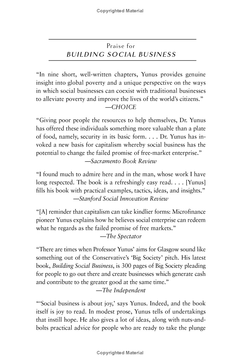 Muhammad Yunus, the practical visionary who pioneered microcredit and, with his Grameen Bank, won the 2006 Nobel Peace Prize, has developed a new dimension for capitalism which he calls "social business." The social business model has been adopted by corporations, entrepreneurs, and social activists across the globe. Its goal is to create self-supporting, viable commercial enterprises that generate economic growth as they produce goods and services to fulfill human needs. In Building Social Business, Yunus shows how social business can be put into practice and explains why it holds the potential to redeem the failed promise of free-market enterprise.