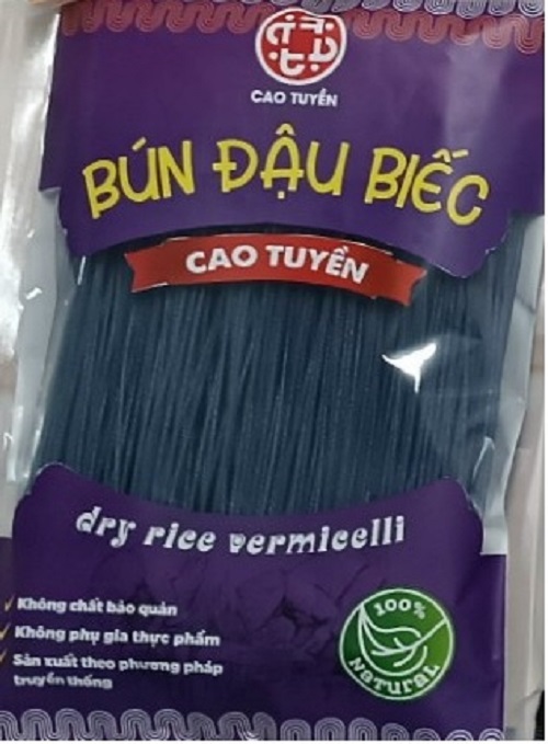 Bún Hoa Đậu Biếc Cao Tuyền- Đặc sản Cao Bằng được sản xuất 100% theo phương pháp truyền thống của người dân Cao Bằng. Bún có màu sắc tự nhiên, không phẩm màu, không hóa chất, không chất bảo quản, phù hợp ăn kiêng và tốt cho sức khỏe. Bún gấc được làm từ hoa đậu biếc và gạo Đoàn Kết của miền núi Cao Bằng. Hoa đậu biếc qua sơ chết sẽ đun lên, lọc lấy nước rồi trộn với đặc sản gạo tẻ, ngâm qua đêm. Sau đó đem gạo xát thành bột, trộn thêm nước hoa đậu biếc để tạo màu. Đem hỗn hợp vừa trộn cho vào ép để ra sản phẩm bún hoa đậu biếc. Nguyên liệu xuất phát hoàn toàn từ nhiên nhiên, cách làm truyền thống tạo ra những sợi bún dai ngon với nhiều công dụng:
