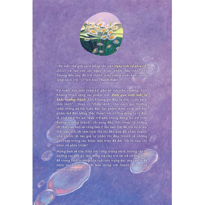 Kỷ niệm hơn một thập kỷ gắn bó với văn chương, Anh Khang trình làng tác phẩm mới: Bước qua nước mắt, tự khắc trưởng thành. Anh Khang gọi đây là một “cuốn sách làm lành” - thay vì “chữa lành” như cách gọi thường thấy trong xã hội hiện đại.