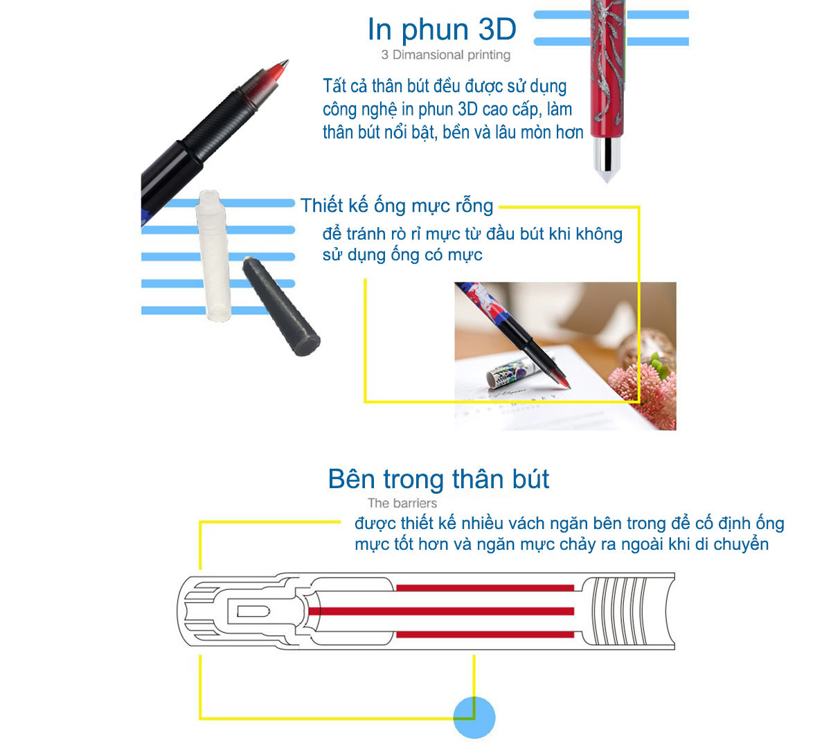 - Màu sắc : Màu xanh - Đặc điểm : + Thiết kế bút nhẹ, vừa tay cầm + Công nghệ mực Free Ink System giúp mực chảy đều, không bị lem mực, tạo nét