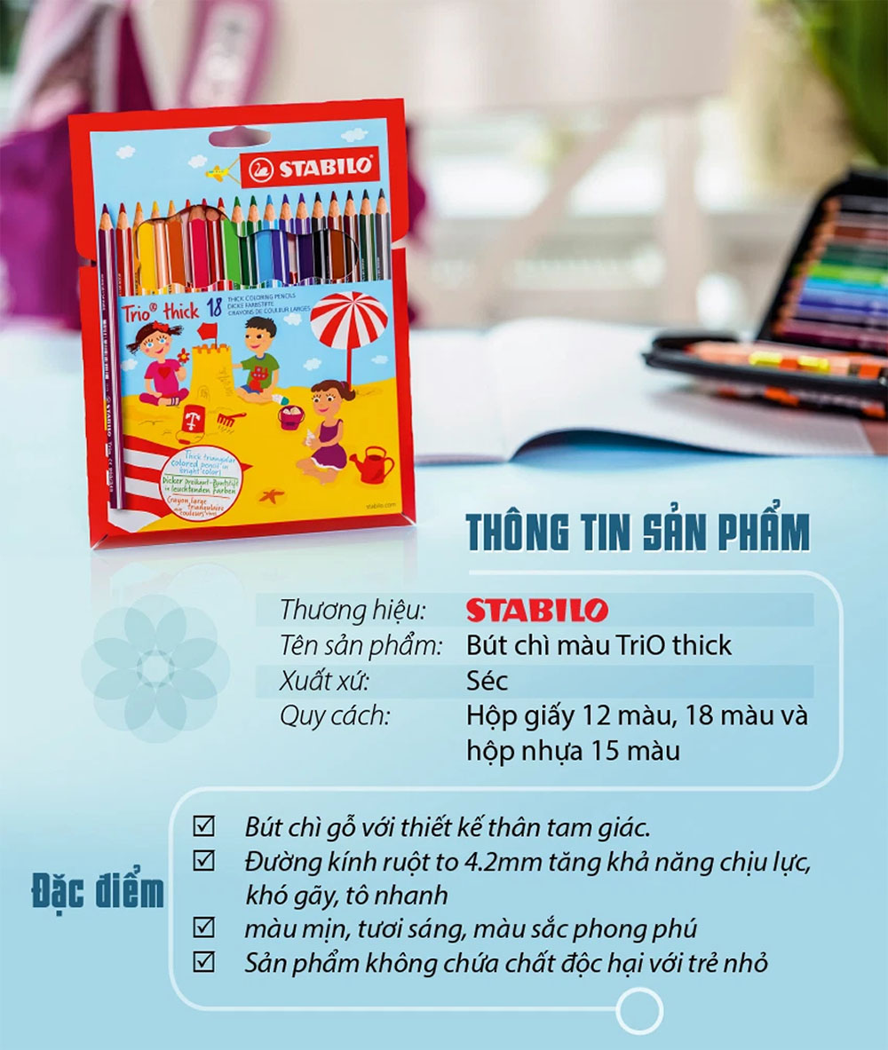 - Bút chì màu thân tam giác, dễ cầm - Ruột to 4.2mm (>50% so với chì màu thường) - Tô nhanh, khó gẫy, màu tươi - Xuất sứ: Séc