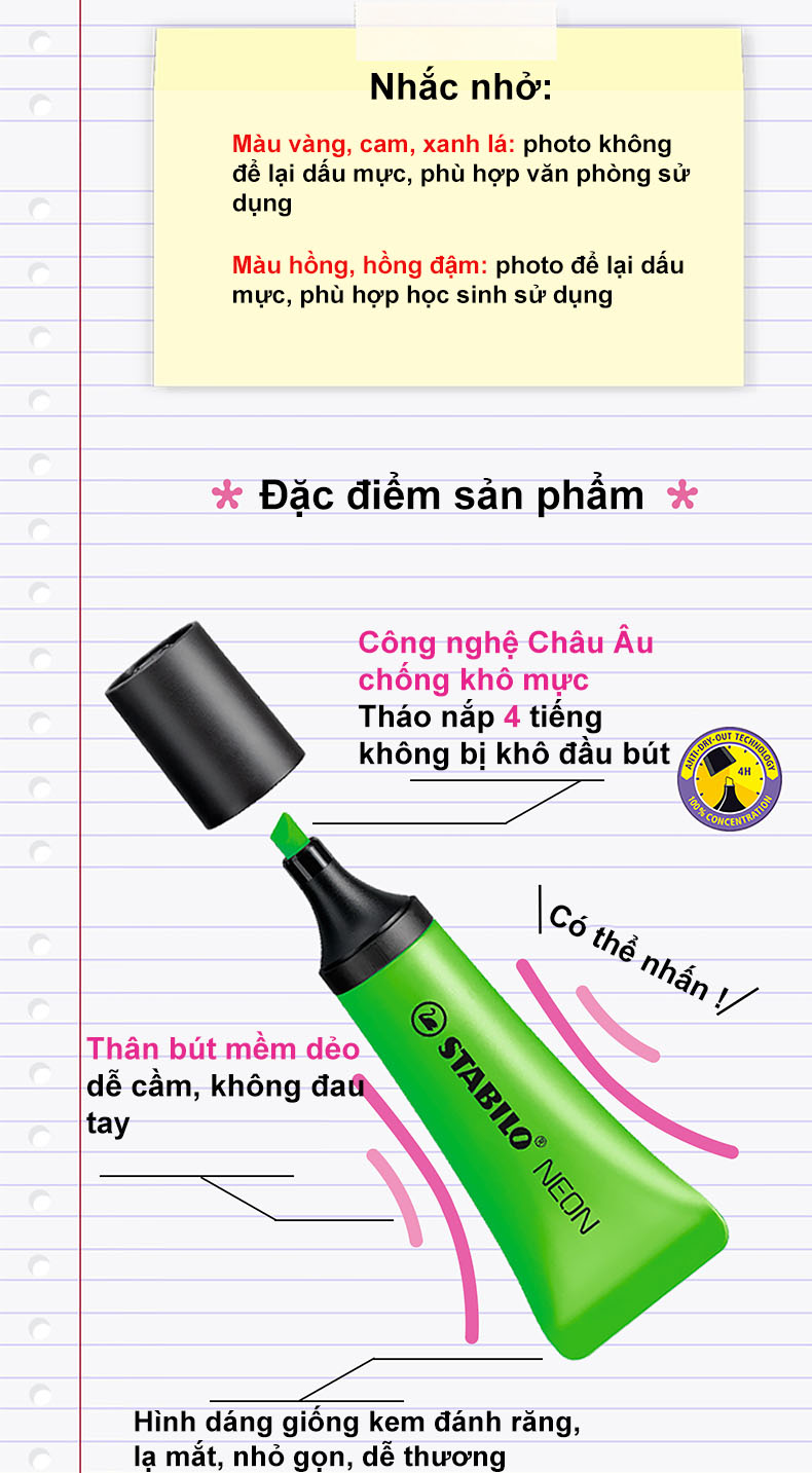 Màu mực tươi sáng hơn Không độc hại Thân bút màu dạ quang trong suốt Sử dụng được cho giấy thường và giấy fax Có thể đánh dấu với khoảng cách hơn 100 m++ Đầu