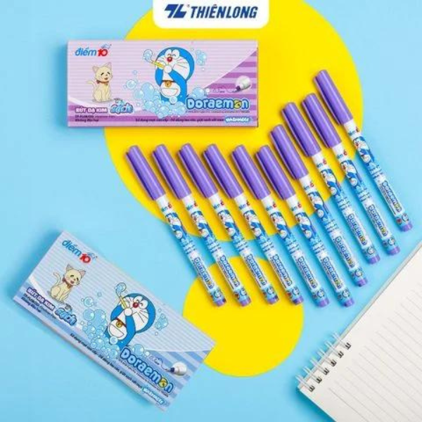 Đầu bi 0.3mm, sản xuất tại Thụy Sỹ, bọc kim loại. Lượng mực viết dài 1200-1500m, không bị lem và đều Bút Dạ Kim Điểm 10 - Doraemon TP- FL-04/DO (Mực Tím) Đầu bi 0.3mm,