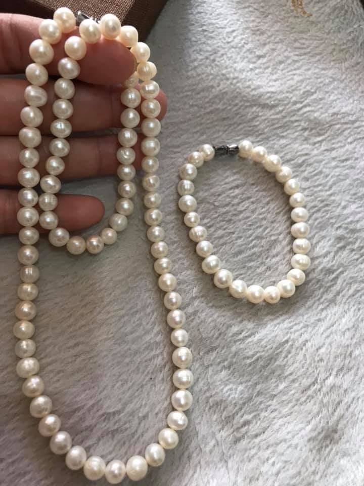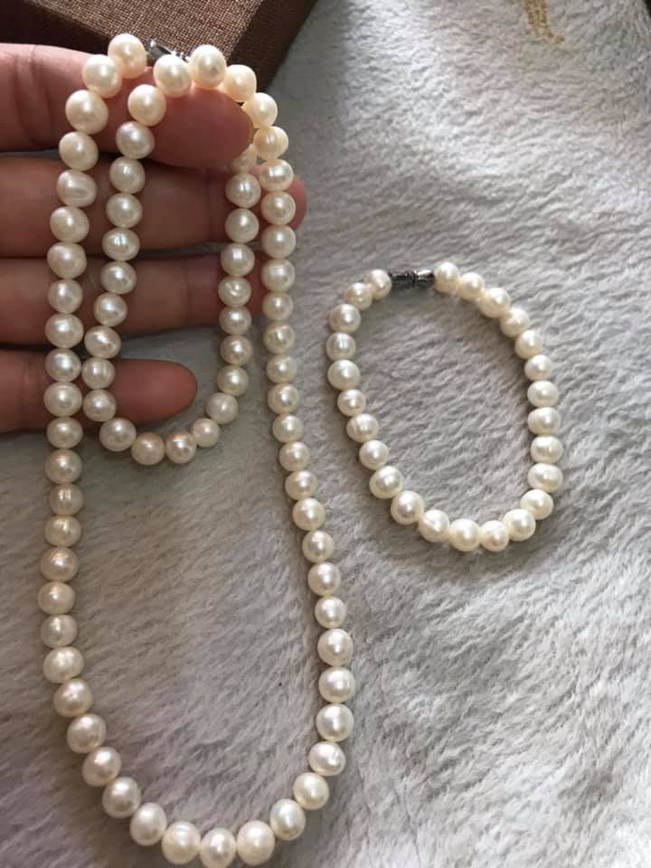 CẢ BỘ VÒNG TAY VÀ DÂY CHUỖI CHẤT LIỆU NGỌC TRAI SIZE HƠN 7MM NỮ ĐEO Ạ