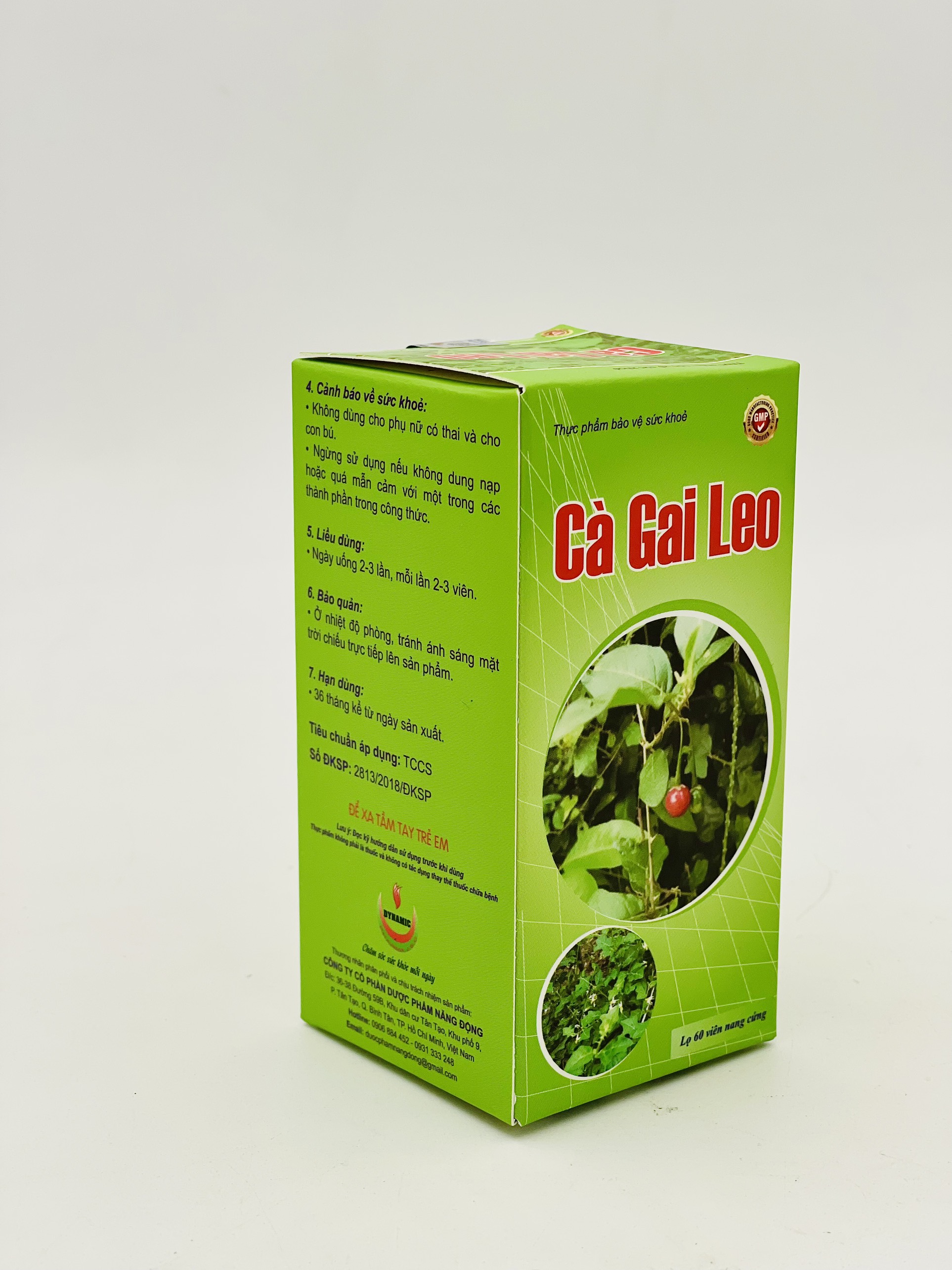 CÀ GAI LEO – NĂNG ĐỘNG Cà Gai Leo được biết đến với nhiều công dụng như: tăng cường chức năng giải độc gan, hạn chế tổn thương tế bào gan, giảm các triệu chứng dị ứng, nổi mề đay, vàng da mệt mỏi do suy giảm chức năng gan Được phân phối bởi Công ty Cổ Phần Dược Phẩm Năng Động Với thành phần dược liệu tự nhiên: ️Cao cà gai leo ️Cao mật nhân ️Và các phụ liệu: Canxi cacbonat, tinh bột sắn, bột talc Đối tượng sử dụng: ️Người bị suy giảm chức năng gan do viêm gan virus, viêm gan B, mạn tính, xơ gan. ️Người bị men gan cao, vàng da mệt mỏi. ️Người uống rượu bia nhiều. Hướng dẫn sử dụng: ️Ngày uống 2-3 lần, mỗi lần 2-3 viên Bảo quản: Ở nhiệt độ phòng, tránh ánh nắng mặt trời chiếu trực tiếp lên sản phẩm. Công ty Cổ Phần Dược Phẩm Năng Động