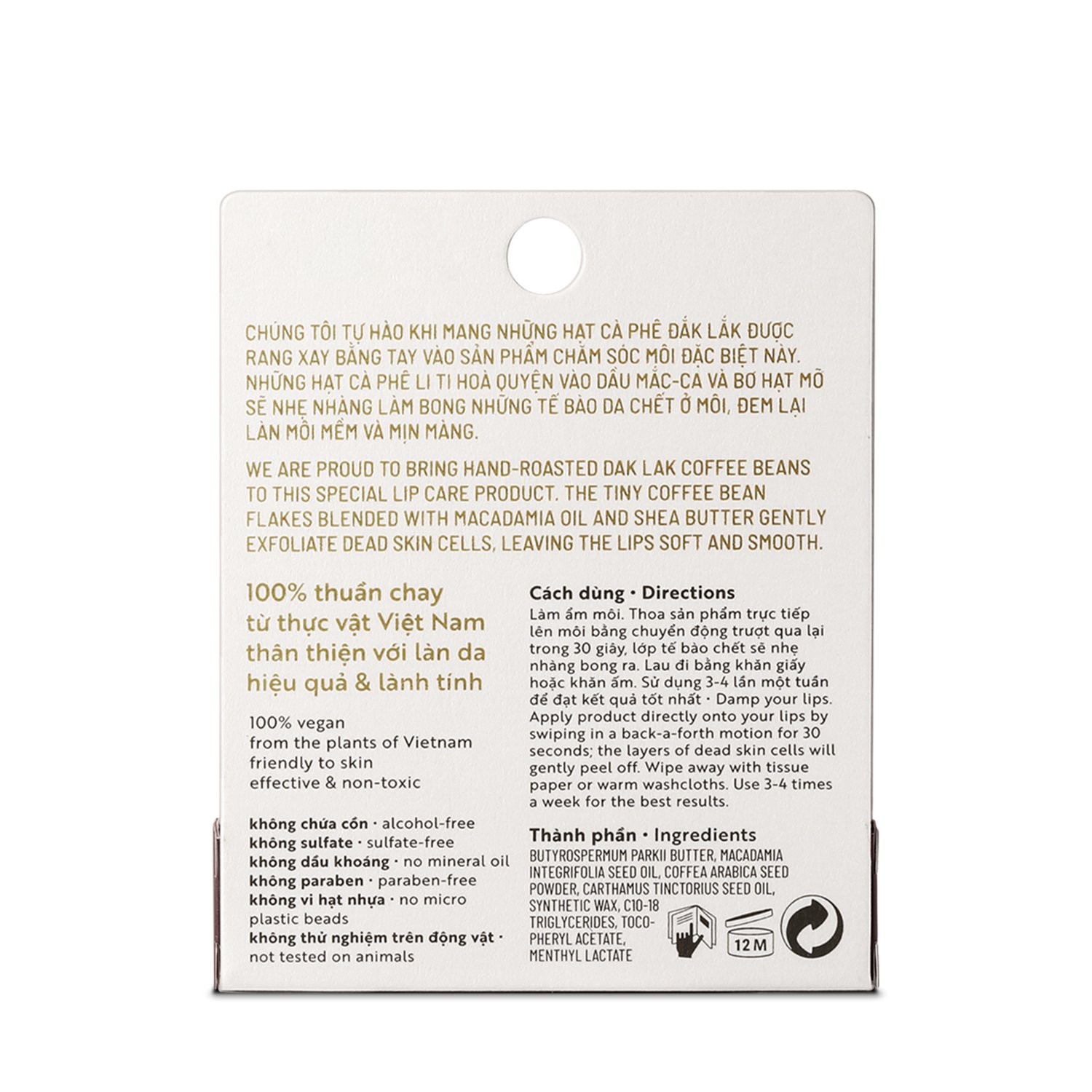 Thành phần chính • Cà phê Đăk Lăk được rang xay bằng tay: Cà phê có tác dụng cao trong việc chống oxi hóa, đặc biệt cafein trong hạt cà phê sẽ giúp da môi hồng hào, mang lạ làn môi mềm mịn. • Bơ hạt mỡ : Có nguồn gốc từ cây Karite, rất giàu Vitamin A,E và F làm ẩm mềm đôi môi • Dầu mắc - ca : Có chứa 60% oleic acid (omega 9) có tác dụng dưỡng ẩm, chống nhăn, làm dịu các tổn thương. Ngoài ra, dầu mắc - ca còn chứa squalene, vitamin E có tác dụng dưỡng ẩm và chống oxy hóa Thành phần đầy đủ BUTYROSPERMUM PARKII BUTTER, MACADAMIA INTEGRIFOLIA SEED OIL, COFFEA ARABICA SEED POWDER, CARTHAMUS TINCTORIUS SEED OIL, SYNTHETIC WAX, C10-18 TRIGLYCERIDES, TOCO-PHERYL ACETATE, MENTHYL LACTATE Hướng dẫn sử dụng Làm ẩm môi. Thoa sản phẩm trực tiếp lên môi bằng chuyển động trượt qua lại trong 30 giây, lớp tế bào chết sẽ nhẹ nhàng bong ra. Lau đi bằng khăn giấy hoặc khăn ấm. Sử dụng 3-4 lần một tuần để đạt kết quả tốt nhất. Cam kết • Không chứa Cồn • Không Sulfate • Không dầu khoáng • Không Paraben • Không vi hạt nhựa • Không thử nghiệm trên động vật HSD: 3 năm kể từ NSX Xuất xứ: Việt Nam