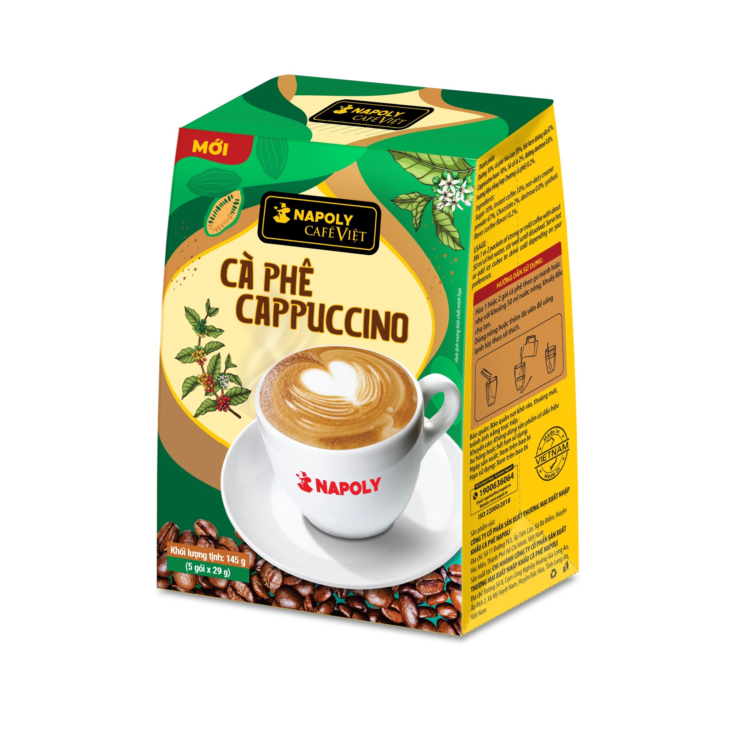 Hộp nhỏ cà phê sữa hòa tan Cappuccino đậm vị cà phê, sữa ngọt ngào, Socola béo ngậy thơm lừng Napoly Coffee (5gói x 29g) NAPOLI – CÀ PHÊ VIỆT – ĐẬM GU ĐÚNG CHẤT