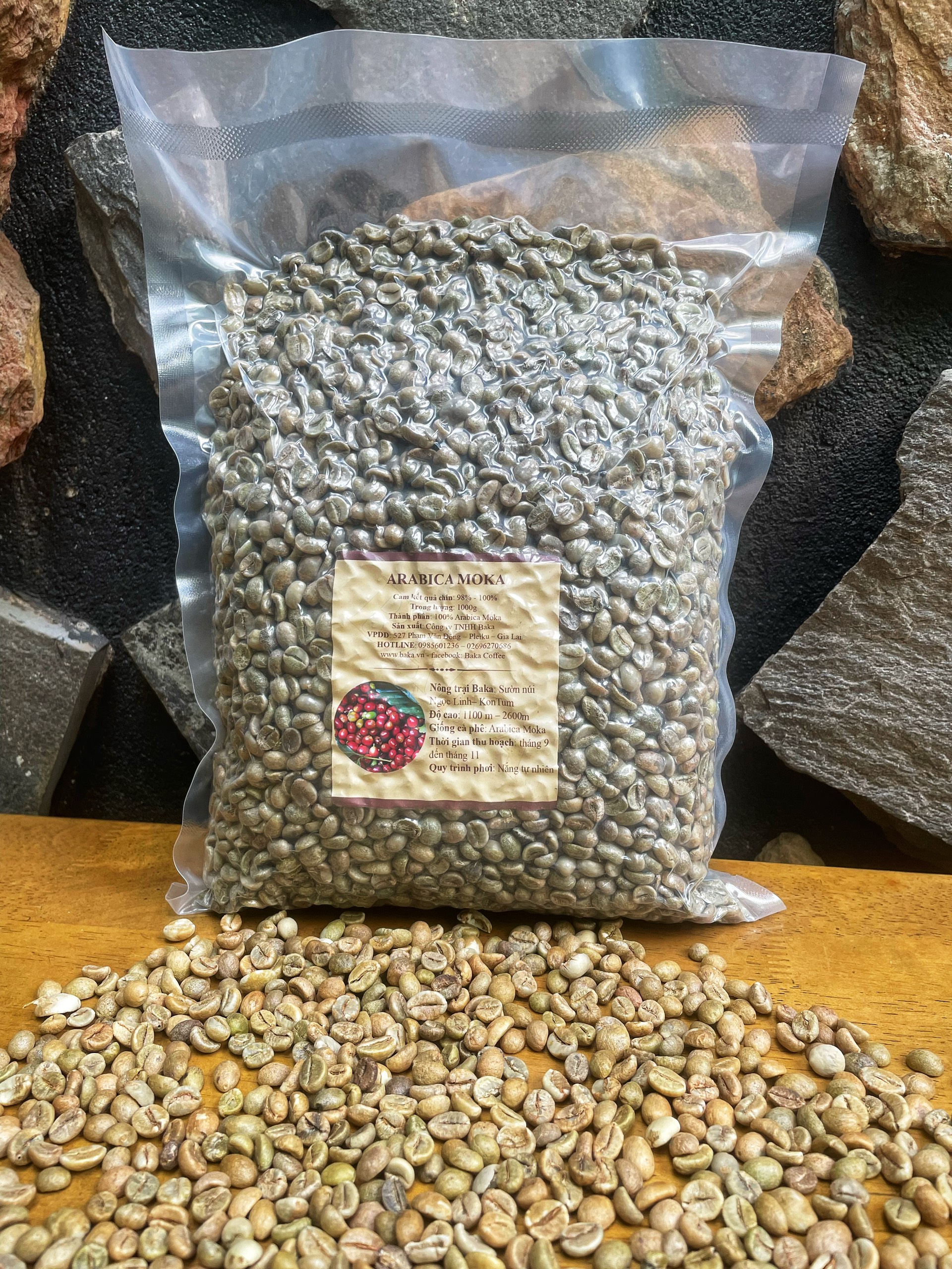 Mua tại TiktokCà phê nhân xanh Arabica Moka chưa qua chế biến. Moka của baka sử dụng nguyên liệu từ những vườn cà phê thuần arabica ít ỏi còn sót lại bên sườn núi Ngọc Linh, vùng đất nổi danh với loại sâm cùng tên. Ở độ cao trên 2000m, arabica ở đây được đồng bào quảng canh gần như là cây rừng, bà con để cây mọc và trời đất chăm bón, tới mùa thì đeo gùi lên hái nên năng suất chẳng cao mà trái cũng chẳng to, Nhưng chất lượng thì tuyệt hảo. Mùi thơm nhẹ nhàng nhưng rất sang, mùi thơm len lỏi đến tận áo quần người uống và đến tận khi uống hết ly vẫn còn thơm. Mùi vị của moka baka rất phong phú, về cơ bản thì vị chát nhẹ, hơi chua, không đắng lắm, mỗi người uống lại cảm nhận khác nhau với loại cà phê tuyệt vời này.