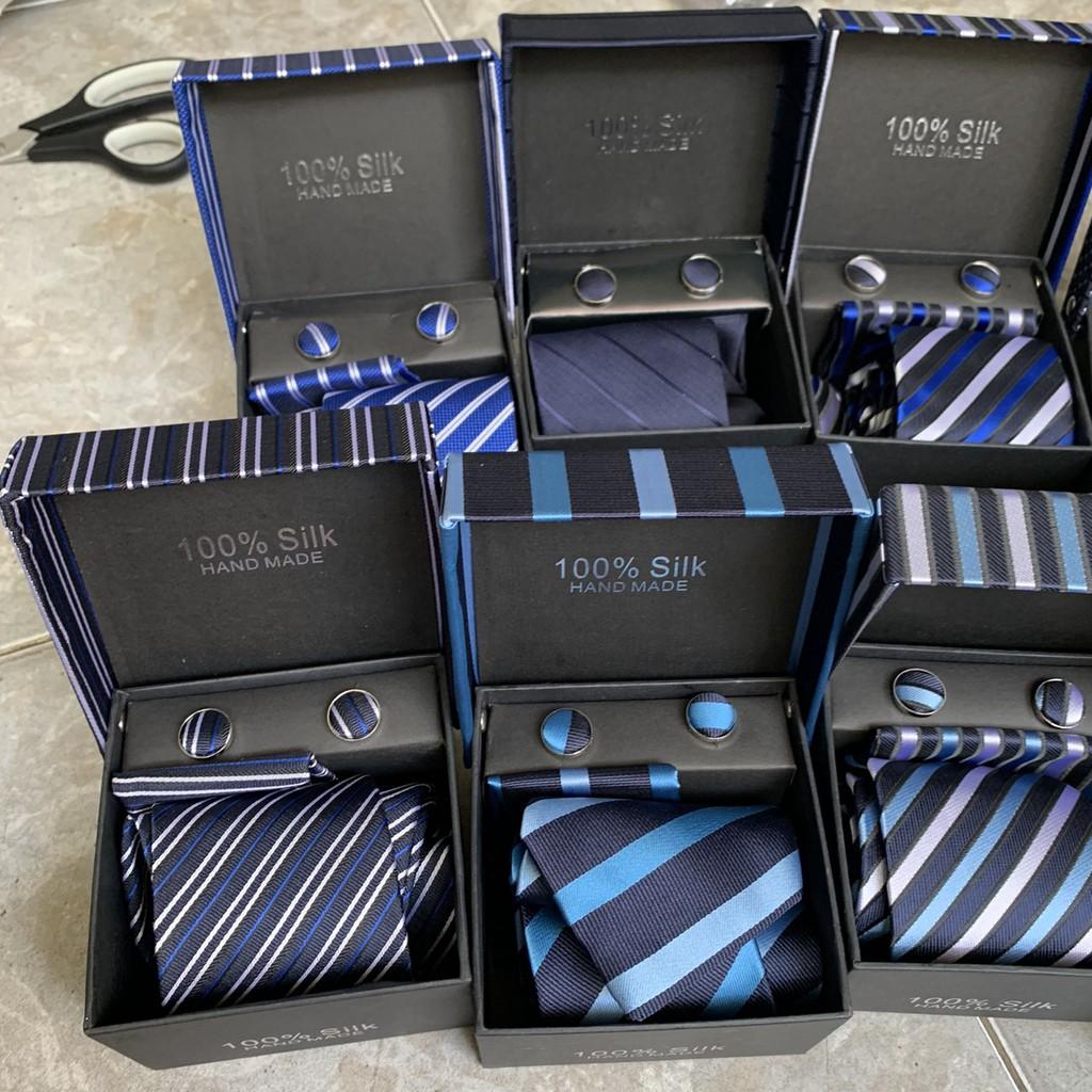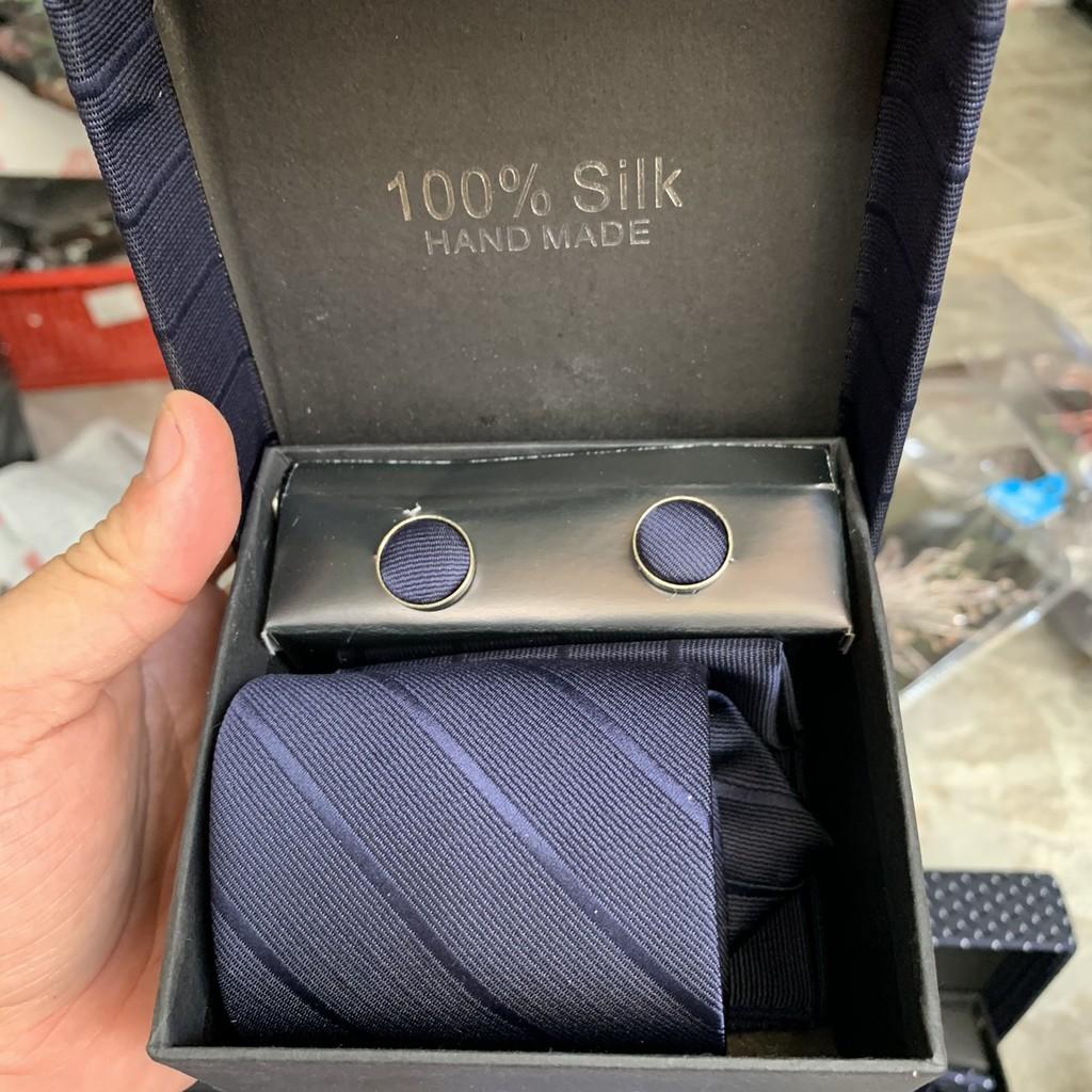Hộp quà tặng gồm 1 cà vạt nam 8cm kích cỡ chuẩn 8cmx150 k. 1 hộp đựng cà vạt , 01 Khăn túi áo véc 20x20 cm , 1 cặp khuy áo măng sét cũng