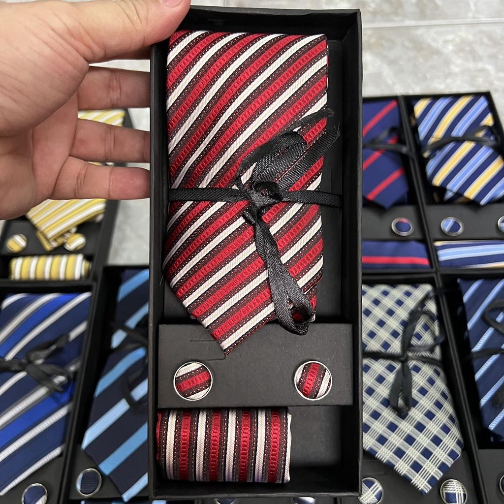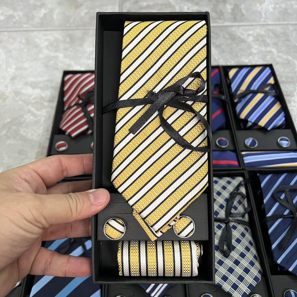 Hộp quà tặng gồm 1 cà vạt nam 8cm kích cỡ chuẩn 8cmx150 k. 1 hộp đựng cà vạt , 01 Khăn túi áo véc 20x20 cm , 1 cặp khuy áo măng sét cũng