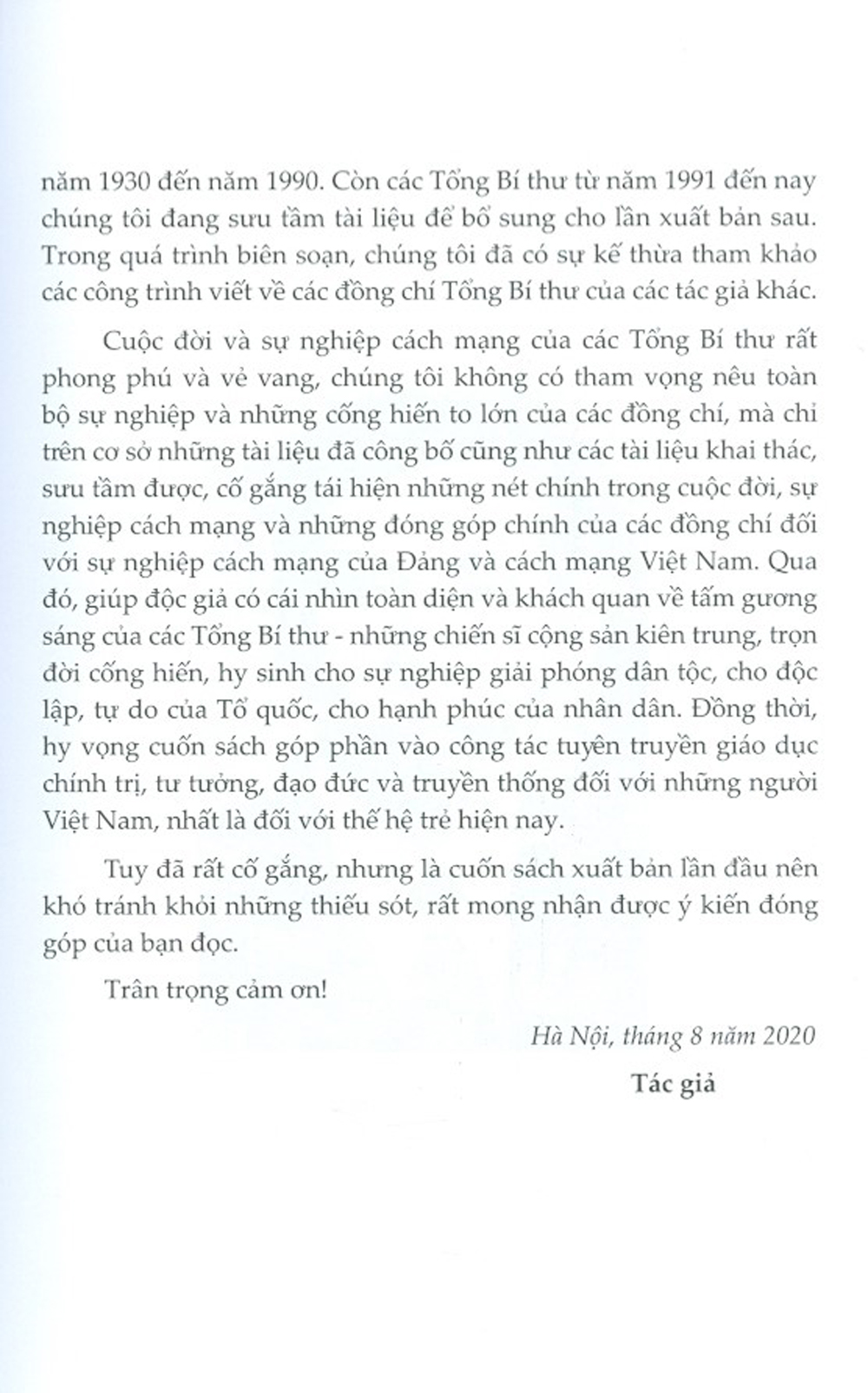 Cuộc đời và sự nghiệp cách mạng của các Tổng Bí thư rất phong phú và vẻ vang, chúng tôi không có tham vọng nếu toàn bộ sự nghiệp và những cống hiến to lớn của các đồng chí, mà chỉ trên cơ sở những tài liệu đã công bố cũng như các tài liệu khai thác, sưu tầm được, cố gắng tái hiện những nét chính trong cuộc đời, sự nghiệp cách mạng và những đóng góp chính của các đồng chí đối với sự nghiệp cách mạng của Đảng và cách mạng Việt Nam. Qua đó, giúp độc giả có cái nhìn toàn diện và khách quan về tấm gương sáng của các Tổng Bí thư - những chiến sĩ cộng sản kiên trung, trọn đời cống hiến, hy sinh cho sự nghiệp giải phóng dân tộc, cho độc lập, tự do của Tổ quốc, cho hạnh phúc của nhân dân. Đồng thời, hy vọng cuốn sách góp phần vào công tác tuyên truyền giáo dục chính trị, tư tưởng, đạo đức và truyền thống đối với những người Việt Nam, nhất là đối với thế hệ trẻ hiện nay.