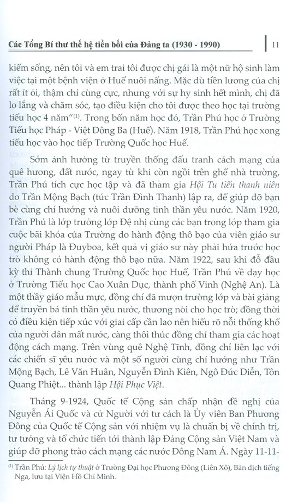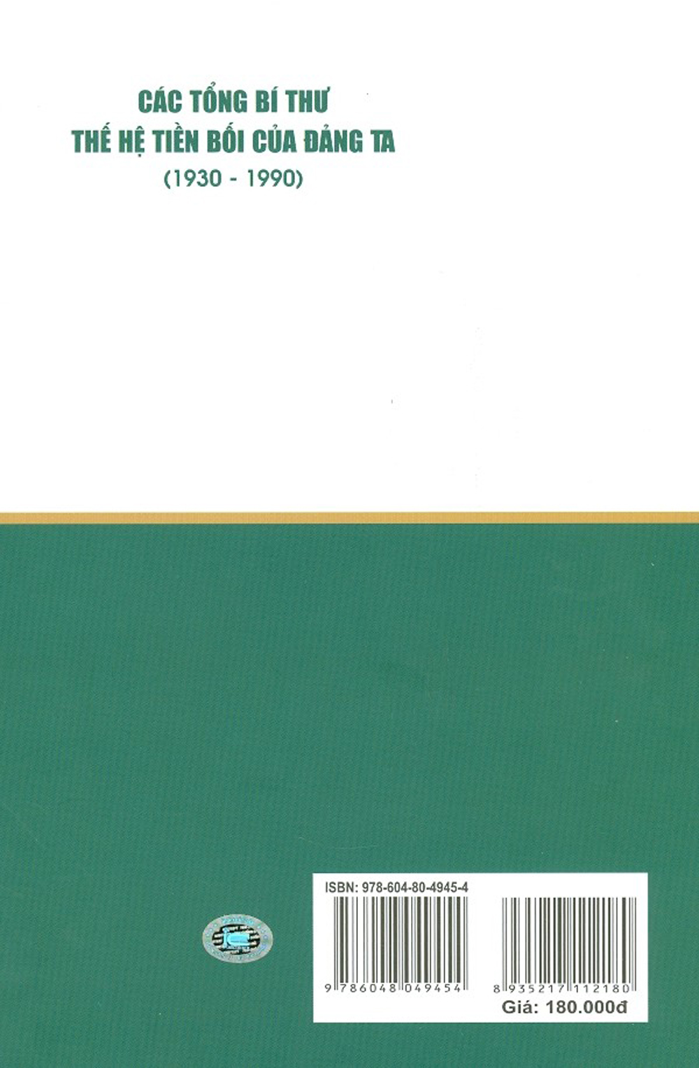 Trong giai đoạn hiện nay, để quán triệt, triển khai và tiếp tục đẩy mạnh việc đề cao trách nhiệm nêu gương của cán bộ, đảng viên, trước hết là người đứng đầu cấp ủy, chính quyền các cấp, chúng tôi biên soạn cuốn sách Các Tổng Bí thư thế hệ tiền bối của Đảng ta (1930 - 1990). Biên soạn cuốn sách, chúng tôi căn cứ vào Quyết định đợt đầu tiên của Bộ Chính trị số 50-QĐ/TW ngày 04/9/2002 về Chương trình viết tiểu sử và hồi ký các đồng chí lãnh đạo chủ chốt của Đảng và Nhà nước ta gồm mười đồng chí, trong đó có bảy đồng chí Tổng Bí thư của Đảng là các đồng chí Trần Phú, Lê Hồng Phong, Hà Huy Tập, Nguyễn Văn Cừ, Trường Chinh, Lê Duẩn, Nguyễn Văn Linh, ngoài ra còn có ba đồng chí là Tôn Đức Thắng, Phạm Văn Đồng và Phạm Hùng. Ở đây, chúng tôi tập trung nghiên cứu về cuộc đời, sự nghiệp và tấm gương của bảy đồng chí Tổng Bí thư từ năm 1930 đến năm 1990. Còn các Tổng Bí thư từ năm 1991 đến nay chúng tôi đang sưu tầm tài liệu để bổ sung cho lần xuất bản sau. Trong quá trình biên soạn, chúng tôi đã có sự kế thừa tham khảo các công trình viết về các đồng chí Tổng Bí thư của các tác giả khác.