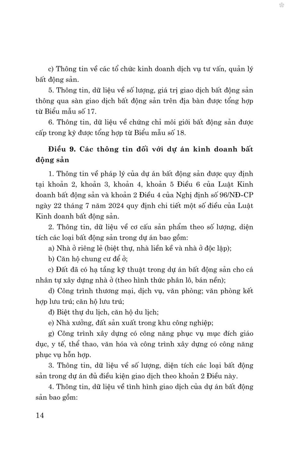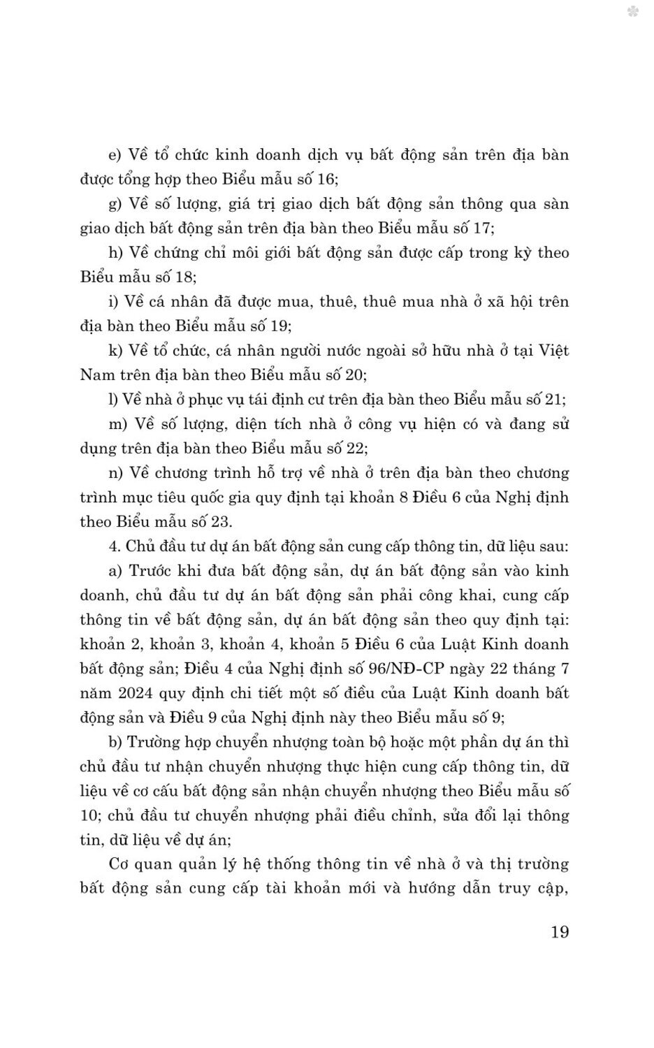 Để kịp thời giải quyết được các vấn đề lớn về kinh doanh bất động sản, đáp ứng yêu cầu của người dân, góp phần phát huy nguồn lực từ bất động sản, quản lý, vận hành hiệu quả thị trường bất động sản trong giai đoạn mới, sau khi Luật Kinh doanh bất động sản năm 2023 (sửa đổi, bổ sung năm 2024) được ban hành, Chính phủ, các bộ đã ban hành các văn bản quy định chi tiết và hướng dẫn thi hành Luật như: Nghị định số 94/2024/NĐ-CP ngày 24/7/2024 của Chính phủ Quy định chi tiết một số điều của Luật Kinh doanh bất động sản về xây dựng và quản lý hệ thống thông tin, cơ sở dữ liệu về nhà ở và thị trường bất động sản; Nghị định số 96/2024/NĐ-CP ngày 24/7/2024 của Chính phủ Quy định chi tiết một số điều của 5 Luật Kinh doanh bất động sản; Thông tư số 04/2024/TT-BXD ngày 30/7/2024 của Bộ Xây dựng Hướng dẫn về chương trình khung đào tạo, bồi dưỡng kiến thức hành nghề môi giới bất động sản, điều hành sàn giao dịch bất động sản; Thông tư số 49/2024/TT-NHNN ngày 25/10/2024 của Ngân hàng Nhà nước Việt Nam Sửa đổi, bổ sung một số điều của Thông tư số 11/2022/TT-NHNN ngày 30/9/2022 của Thống đốc Ngân hàng Nhà nước Việt Nam quy định về bảo lãnh ngân hàng.
