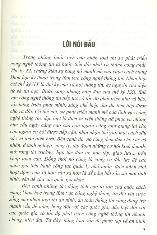 Trong những bước tiến của nhân loại thì sự phát triển công nghệ thông tin là bước tiến dài nhất và thành công nhất. Thế kỷ XX chứng kiến sự bùng nổ mạnh mẽ của cuộc cách mạng khoa học kỹ thuật trong lĩnh vực công nghệ thông tin. Nhân loại coi thế kỷ XX là thế kỷ của xã hội thông tin, kỷ nguyên của điện tử và tin học. Bước sang những năm đầu của thế kỷ XXI, lĩnh vực công nghệ thông tin tiếp tục có tốc độ phát triển như vũ bão, với hàng triệu phát minh, sáng chế hiện đại đã liên tiếp được cho ra đời. Có thể nói, sự phát triển mạnh mẽ của lĩnh vực công nghệ thông tin, đặc biệt là điện tử viễn thông đã phục vụ những nhu cầu ngày càng cao của con người cũng như mang lại cho con người cơ hội được tiếp cận, nhìn nhận thế giới một cách sâu sắc và toàn diện hơn. Bên cạnh đó, nó cũng đem đến cho các cá nhân, doanh nghiệp, công ty, tập đoàn những cơ hội kinh doanh, mở rộng thị trường, hợp tác đầu tư, học tập, giao lư trên khắp toàn cầu. Đồng thời nó cũng là công cụ đắc lực để các quốc gia tiến hành công tác quản lý nhà nước, điều hành mọi hoạt động của xã hội; sâu xa hơn là để nắm bắt sâu sát mọi tình hình, vấn đề của các quốc gia khác. B Bên cạnh những tác động tích cực to lớn của cuộc cách mạng khoa học trong lĩnh vực công nghệ thông tin đối với cuộc sống của nhân loại thì an ninh, an toàn thông tin cũng đang trở thành vấn đề nóng bỏng đối với các quốc gia, đặc biệt đối với các quốc gia có tốc độ phát triển công nghệ thông tin nhanh chóng, hiện đại. Từ đây, hàng loạt vấn đề phức tạp về an ninh thông tin đã bị bùng phát, nảy sinh gây ra rất nhiều hệ lụy, tác động đến tình hình chính trị thế giới. Những quốc gia trực tiếp có liên quan đến những vụ việc phức tạp này đều chịu những ảnh hưởng, tác động không hề nhỏ trong cả vấn đề đối nội, lẫn công tác ngoại giao với các quốc gia khác.