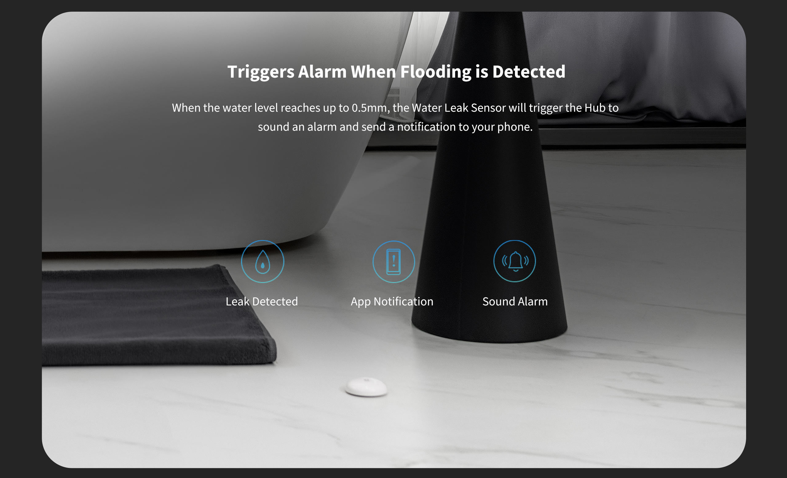 Kích hoạt cảnh báo và thông báo đẩy trung tâm Aqara: Khi mực nước lên tới 0,5 mm, Cảm biến rò rỉ nước sẽ kích hoạt Hub để báo thức và gửi thông báo tới điện thoại của bạn.