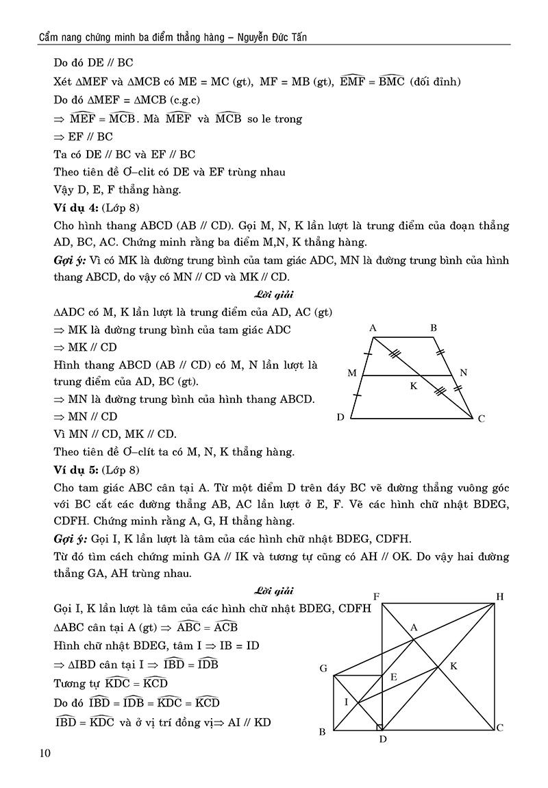 Hơn nữa, các em học sinh thường rất lúng túng, e ngại với dạng bài toán chứng minh ba điểm thẳng hàng. Từ các lí do trên, cùng với niềm đam mê, yêu thích Hình học, cộng thêm sự động viên của các bạn đồng nghiệp, chúng tôi mạnh dạn sưu tầm, biên soạn các bài toán chứng minh ba điểm thẳng hàng, thêm nữa còn cố gắng “Xoay chuyển” các bài toán về chứng minh sự bằng nhau, chứng minh hai đường thẳng song song, chứng minh hai đường thẳng vuông góc, thành các bài toán chứng minh ba điểm thẳng hàng để giới thiệu đến quý bạn đọc quyển sách “CẨM NANG CHỨNG MINH BA ĐIỂM THẲNG HÀNG” (Sách dùng cho học sinh các lớp 7, 8, 9)